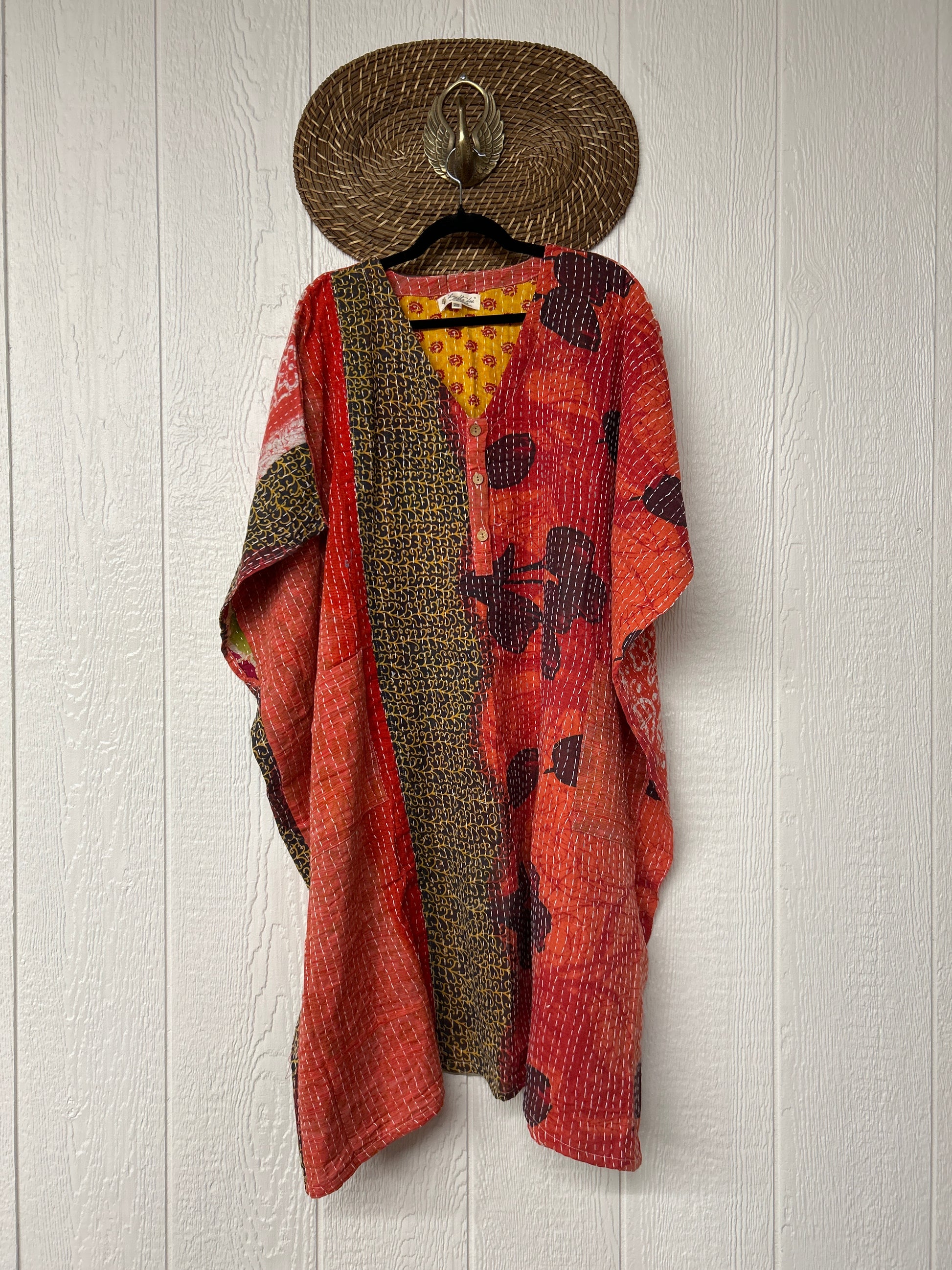 Crafted in our lux vintage Kantha stitch cotton sari, this floaty muu is in a new midi length with buttons at the neckline and slouchy exterior pockets.