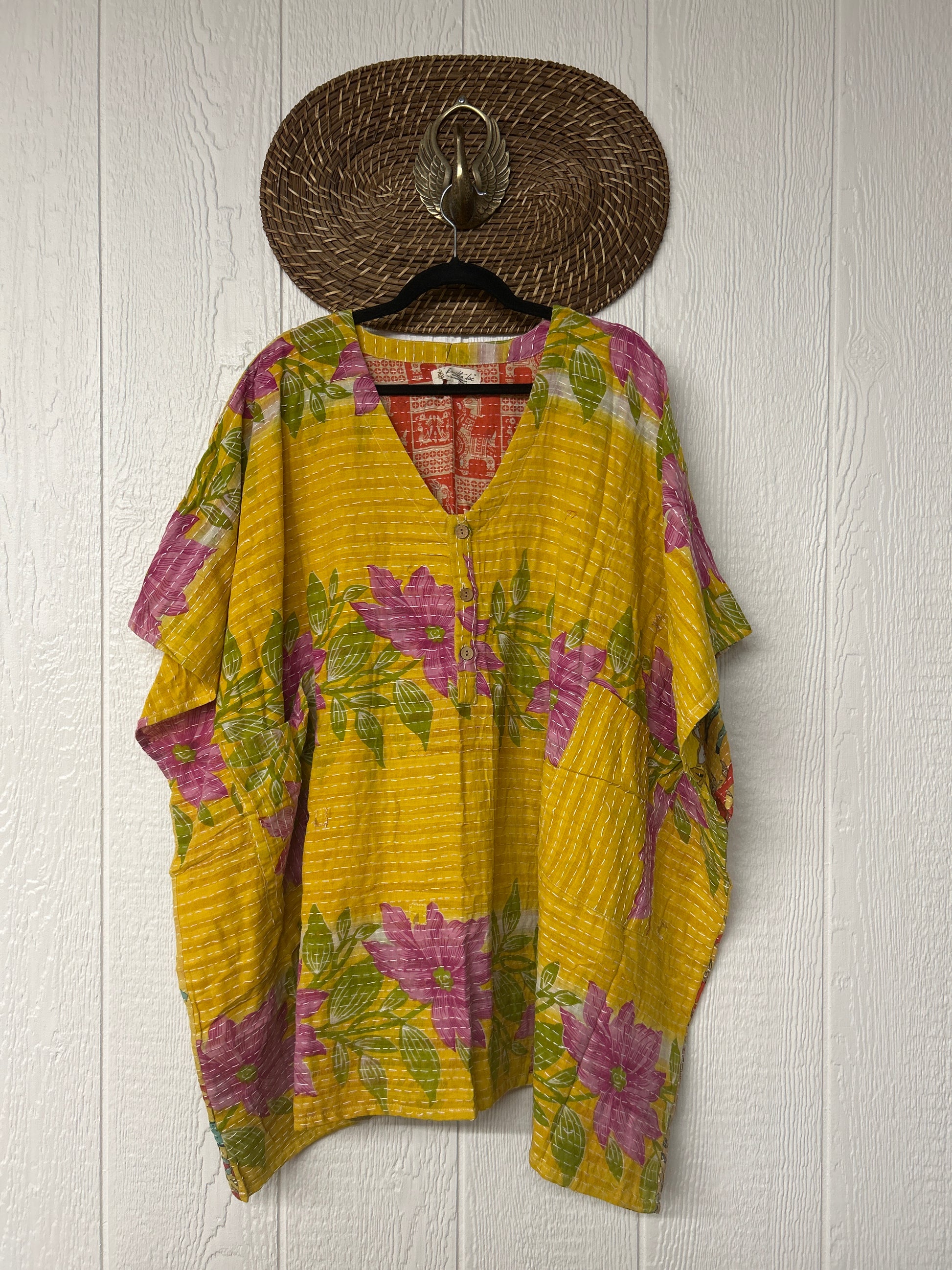 Crafted in our lux vintage kantha stitch cotton sari, this floaty muu is in a new mini length with buttons at the neckline and slouchy exterior pockets.