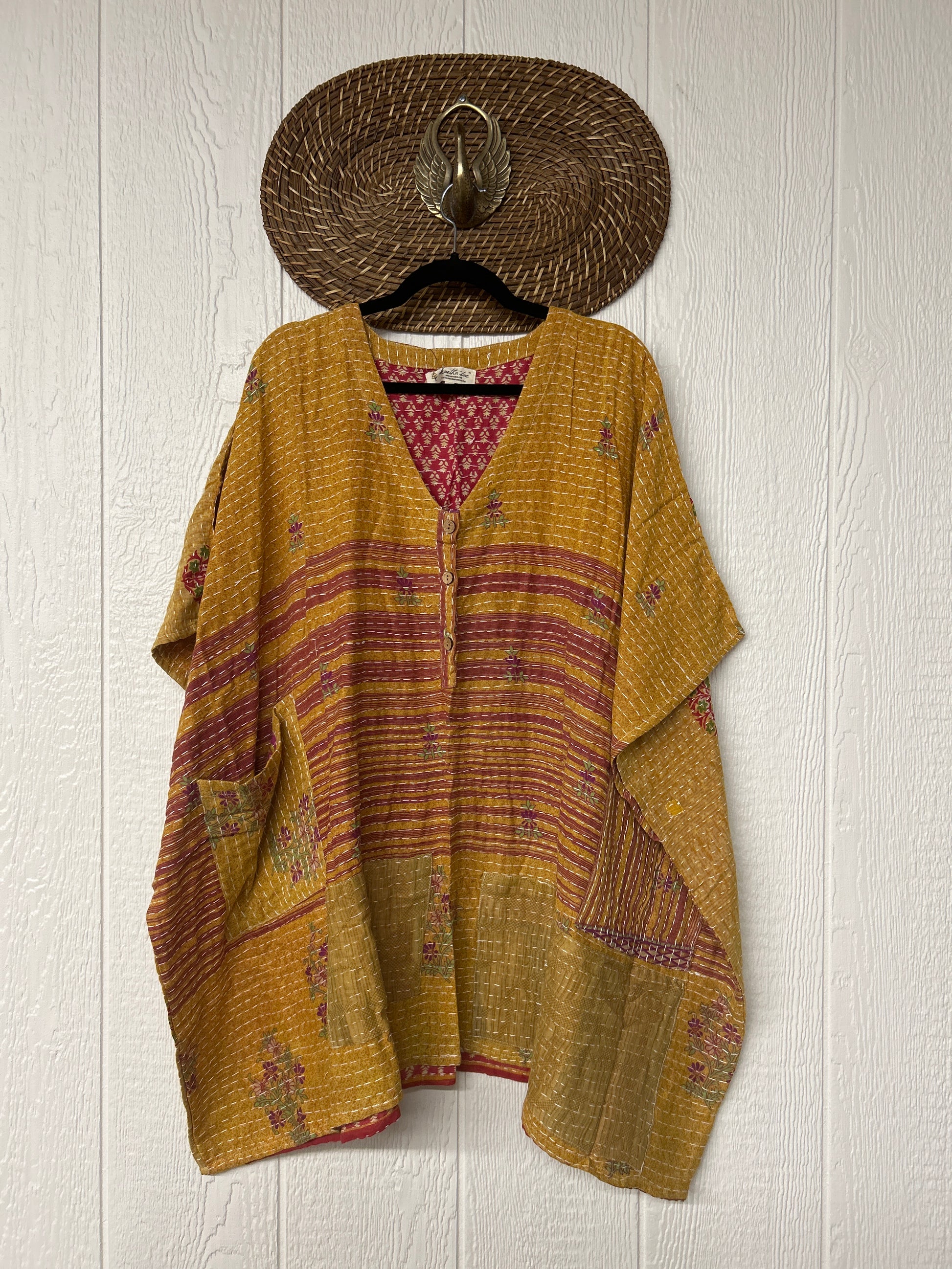 Crafted in our lux vintage kantha stitch cotton sari, this floaty muu is in a new mini length with buttons at the neckline and slouchy exterior pockets.
