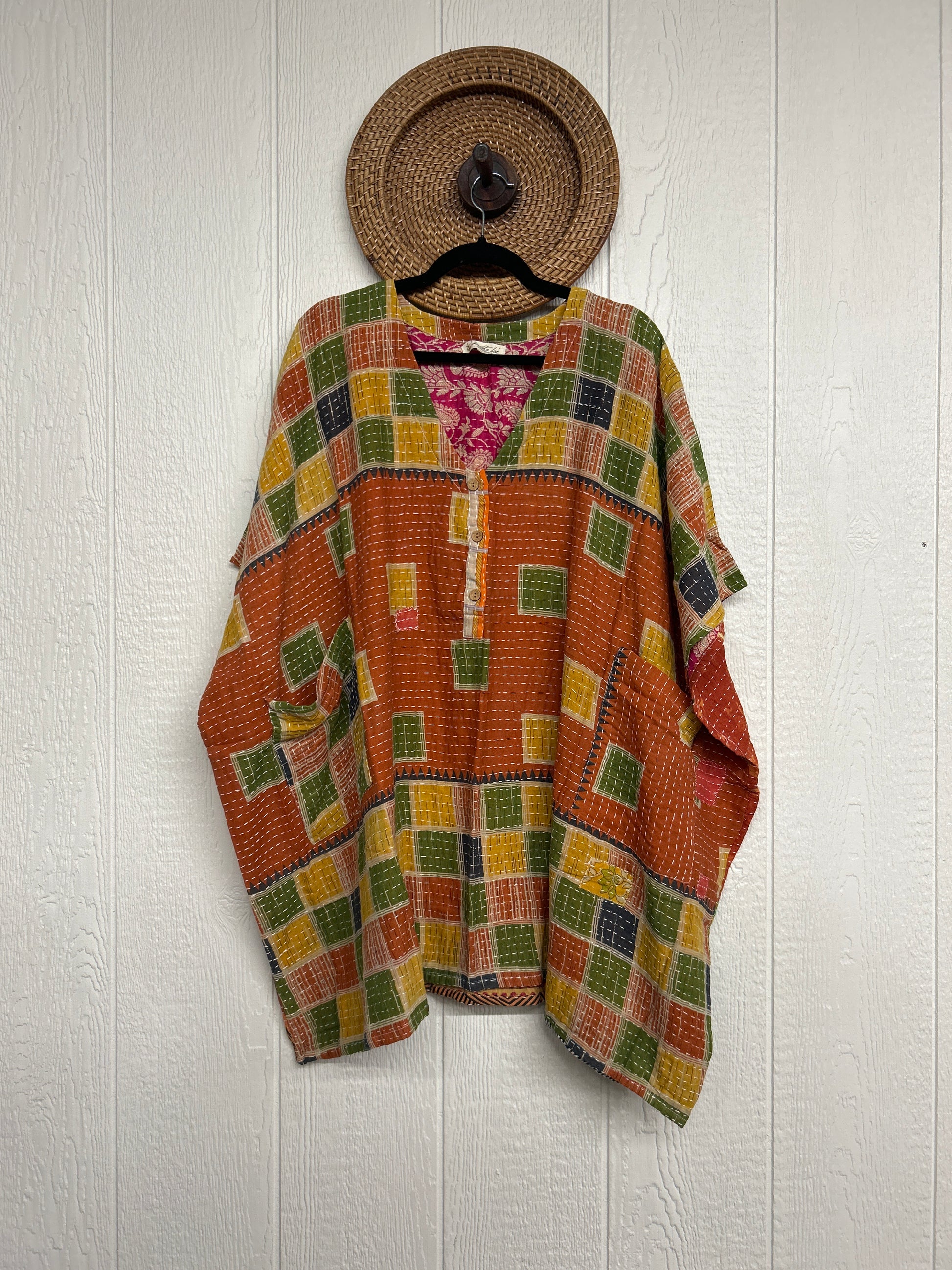 Crafted in our lux vintage kantha stitch cotton sari, this floaty muu is in a new mini length with buttons at the neckline and slouchy exterior pockets.