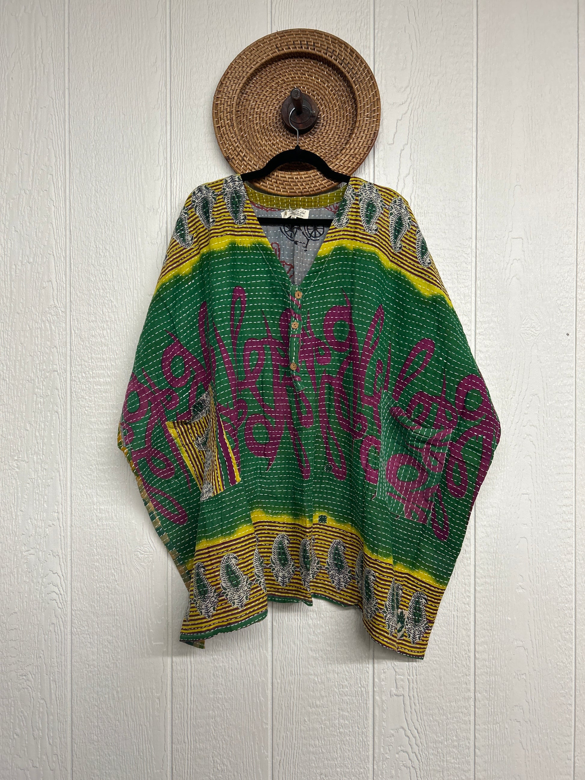 Crafted in our lux vintage kantha stitch cotton sari, this floaty muu is in a new mini length with buttons at the neckline and slouchy exterior pockets.