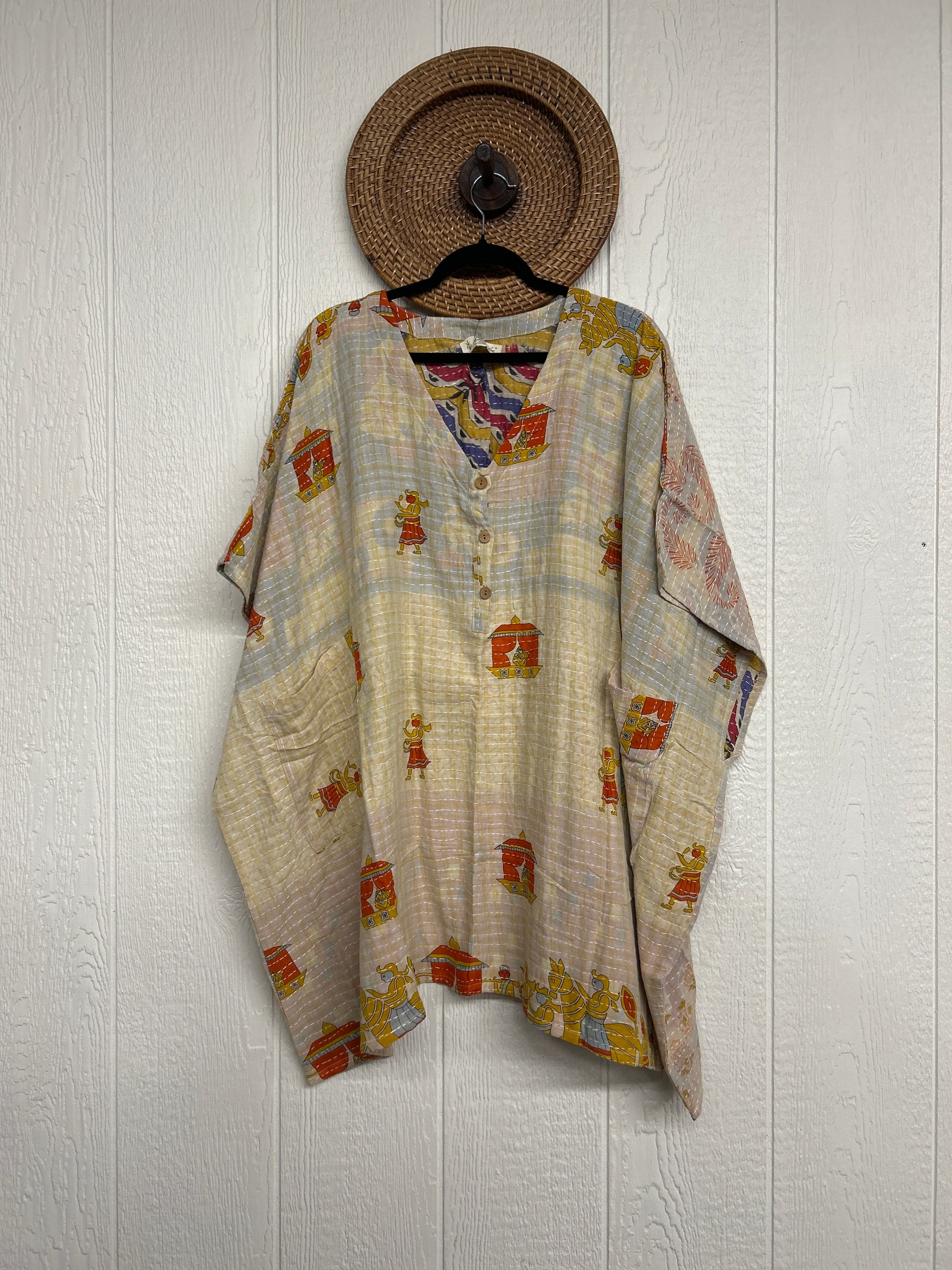 Crafted in our lux vintage kantha stitch cotton sari, this floaty muu is in a new mini length with buttons at the neckline and slouchy exterior pockets.