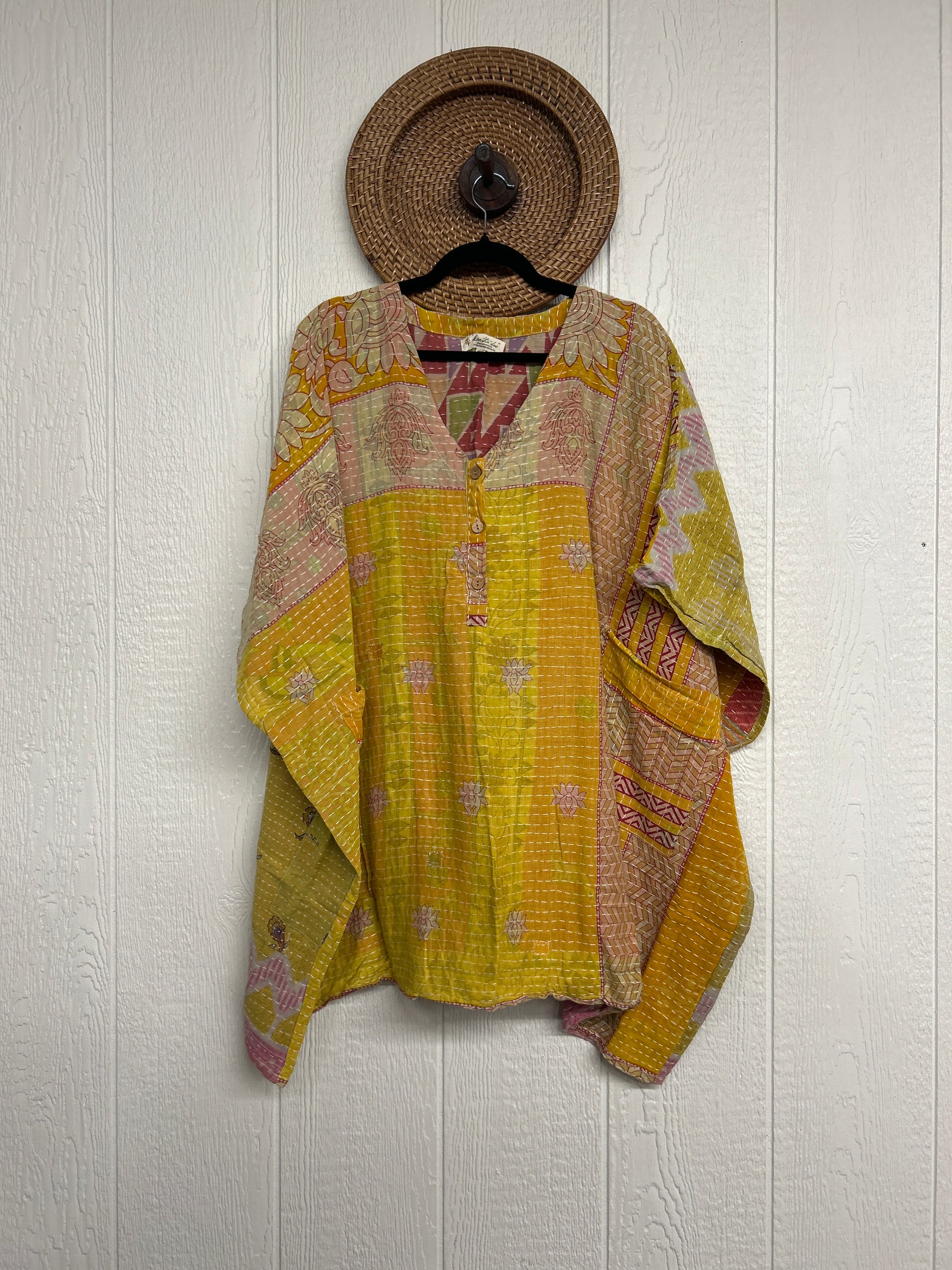 Crafted in our lux vintage kantha stitch cotton sari, this floaty muu is in a new mini length with buttons at the neckline and slouchy exterior pockets.