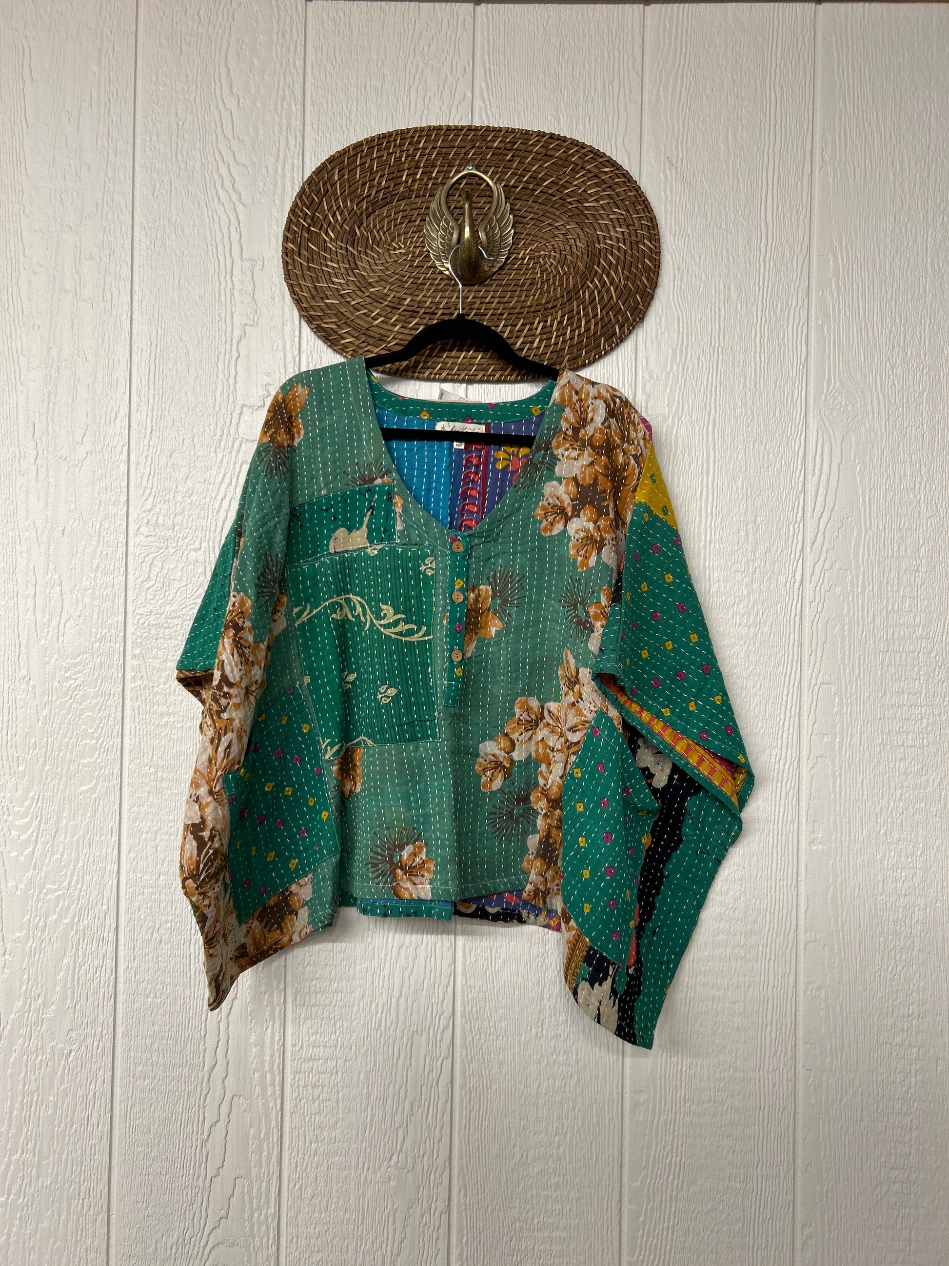Made from our ultra luxe kantha stitch cotton sari, this effortless piece features 3 functional buttons and two slouchy pockets.