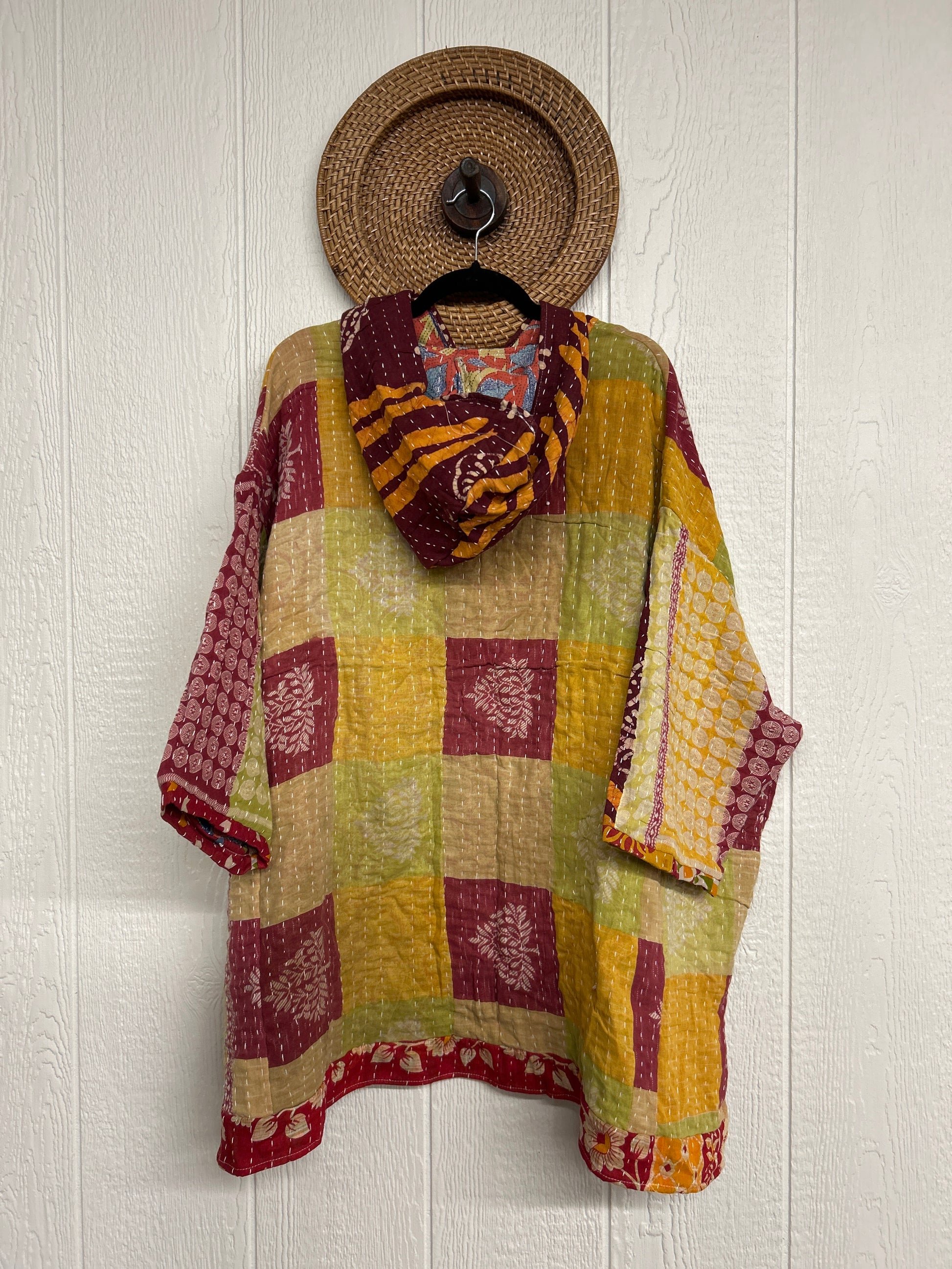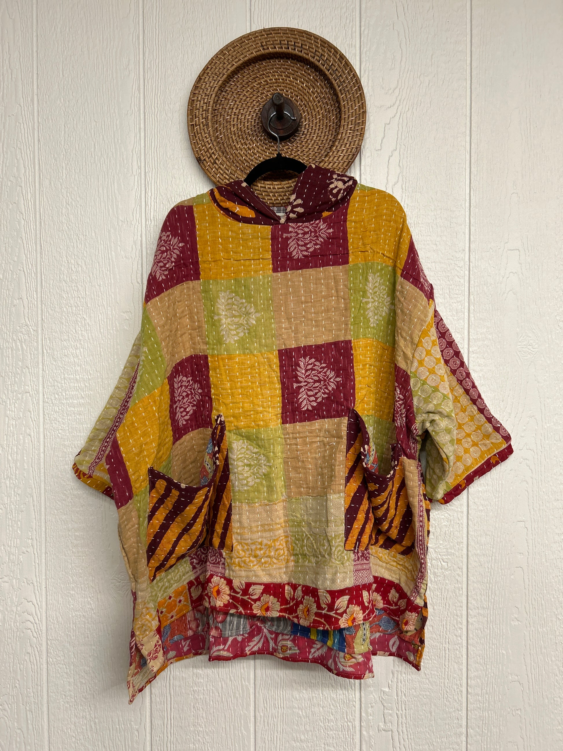 Crafted from koverlet kantha stitched cotton sari this slouchy hoodie features two exterior slouchy pockets for your treasures, a high low hem and hood.