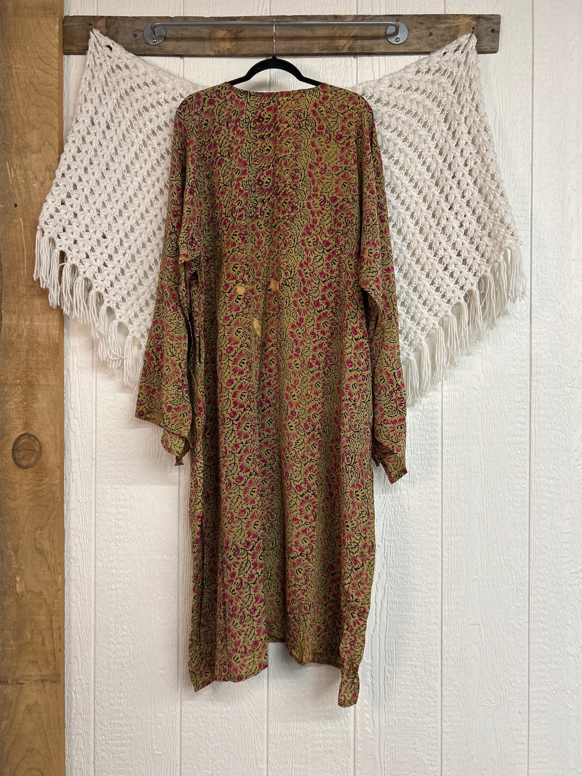 Crafted from our ultra lux vintage crepe sari this floaty dream features wide bell sleeves, deep v neckline, maxi silhouette with side slits for extra dimension.