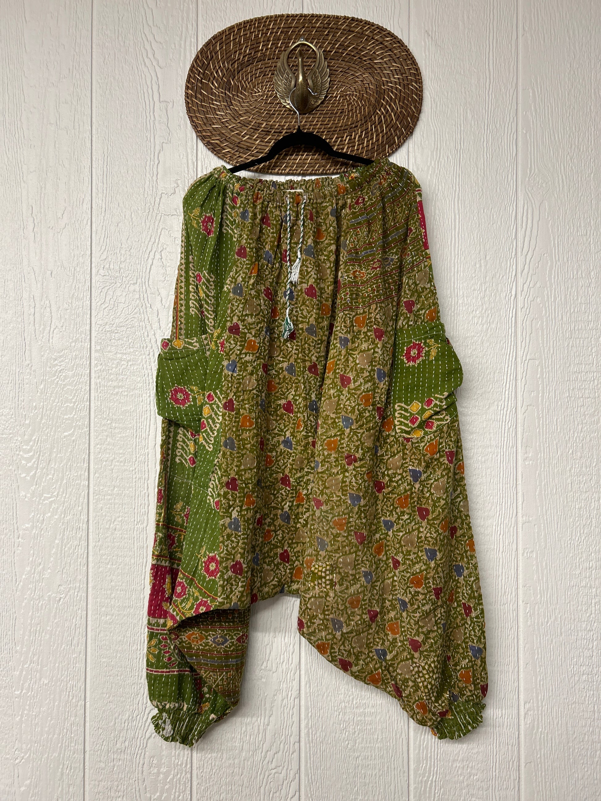 Made from our vintage kantha cotton sari with a super slouchy low harem crotch drop, slouchy exterior pockets, elastic waist with drawstring snd soft smocked elastic on the ankles.