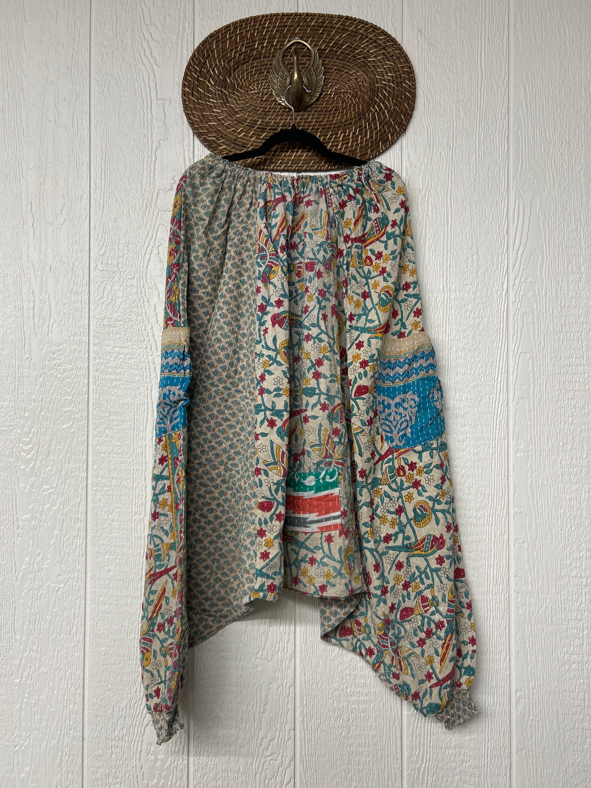 Made from our vintage kantha cotton sari with a super slouchy low harem crotch drop, slouchy exterior pockets, elastic waist with drawstring snd soft smocked elastic on the ankles.