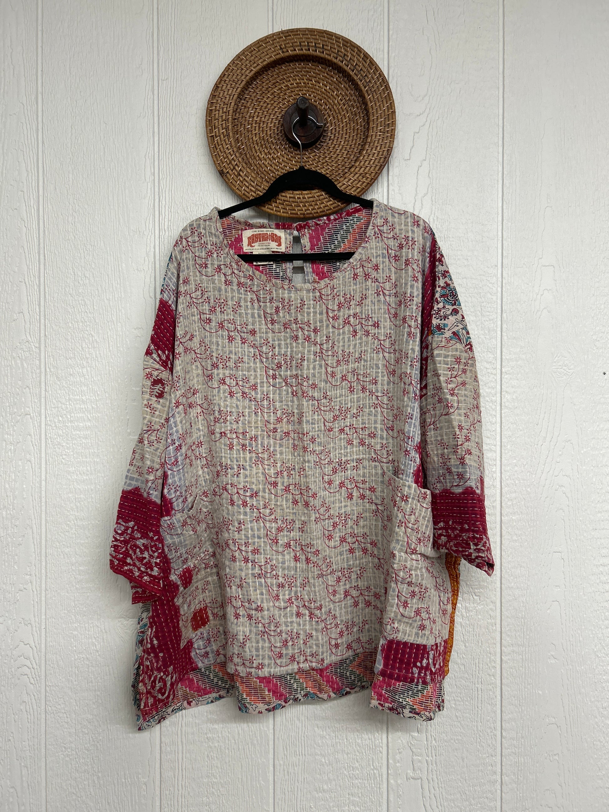 Features key hole in the back, slouchy pockets, a scoop neckline, high low hem with side slits for extra dimension. The Kantha Dream Pullover is fully reversible giving you two tops in one. We know it will be your new go to.