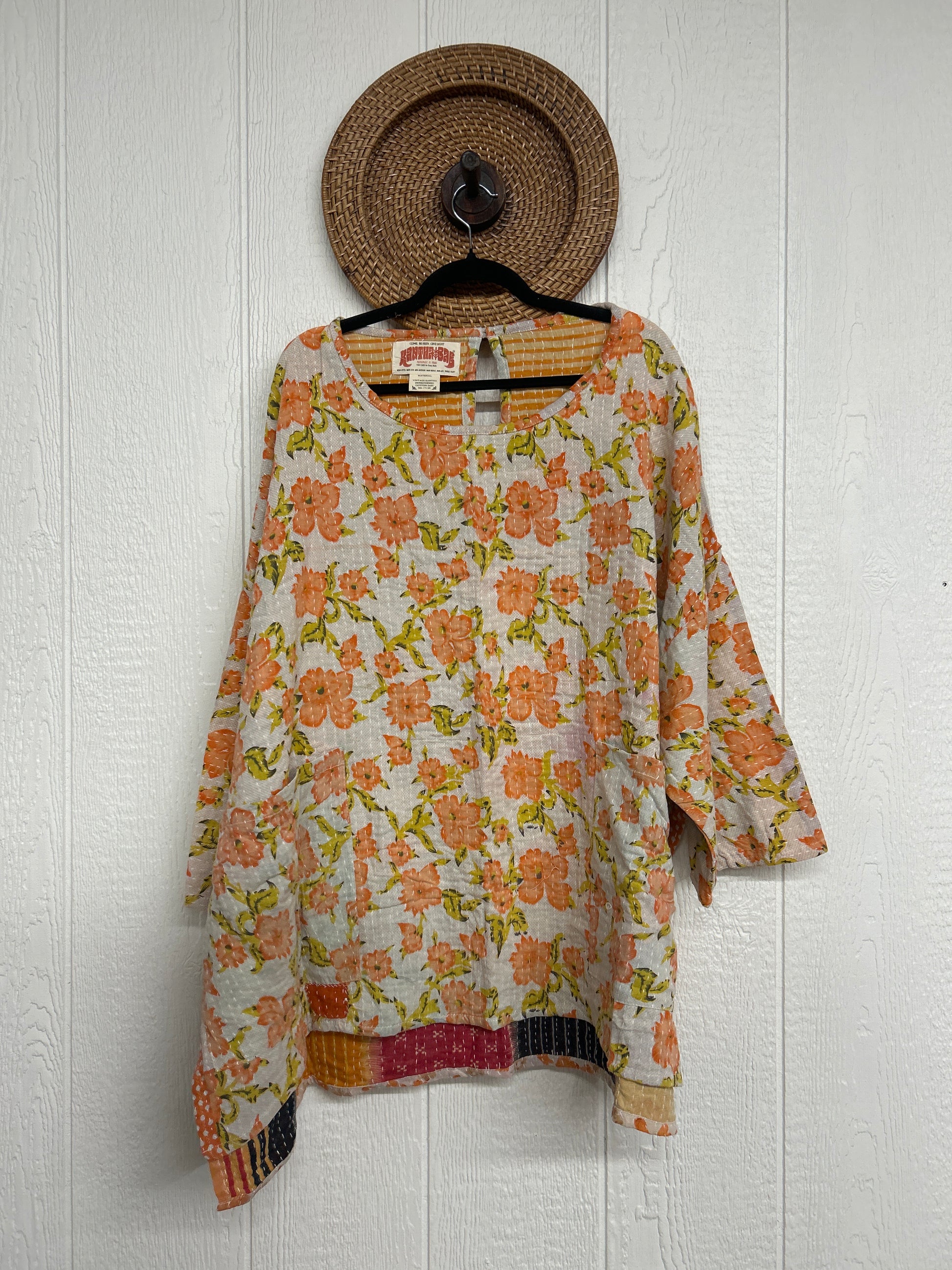 Features key hole in the back, slouchy pockets, a scoop neckline, high low hem with side slits for extra dimension. The Kantha Dream Pullover is fully reversible giving you two tops in one. We know it will be your new go to.
