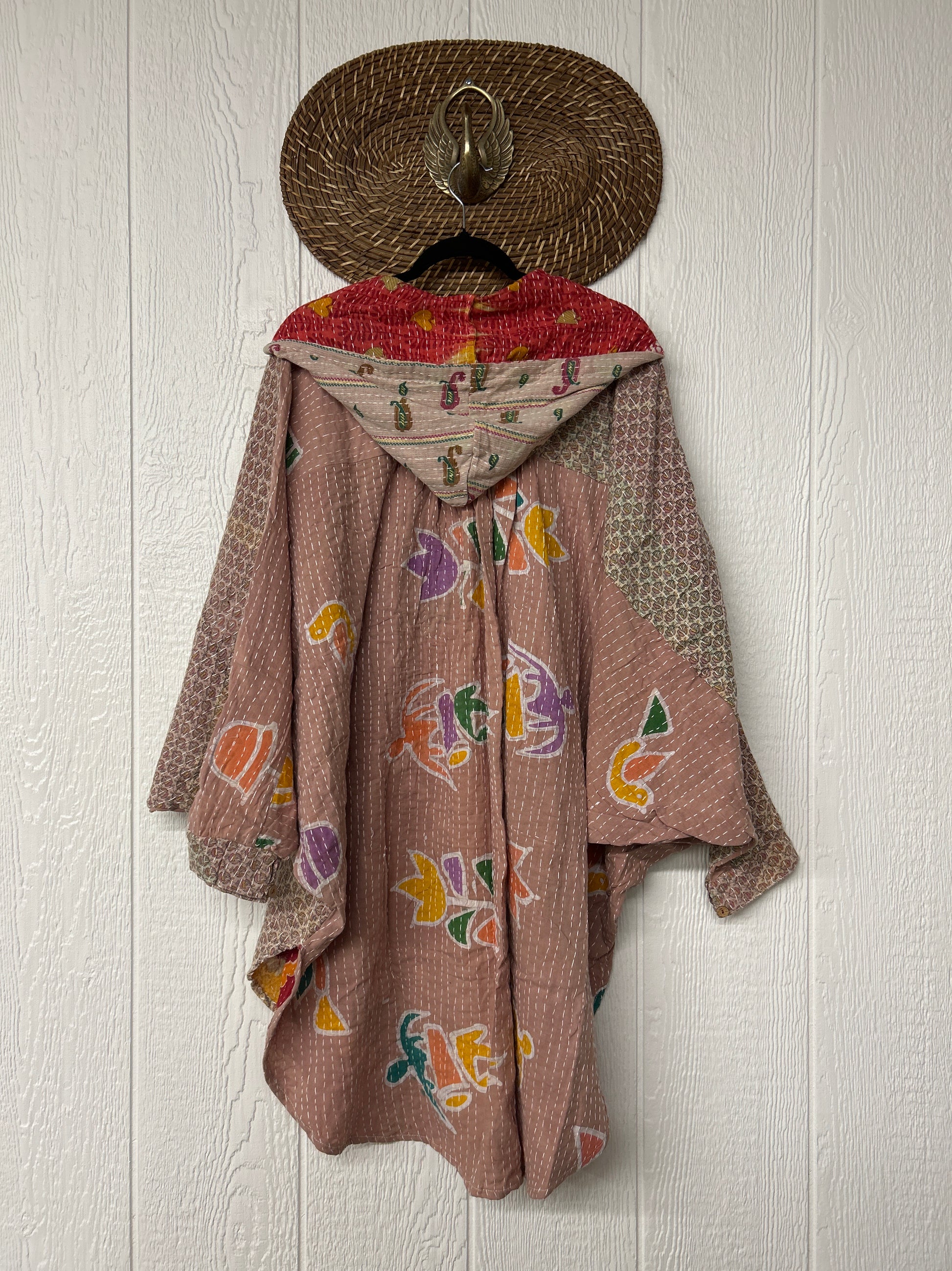 Made from our hand kantha stitched vintage cotton sari, this piece of wearable art features a Button-down opening with functional buttons, slouchy outer pockets, billowy sleeves, a rounded hemline and a vibey hood. The perfect top to compliment your favorite kantha pants or bell bottoms.