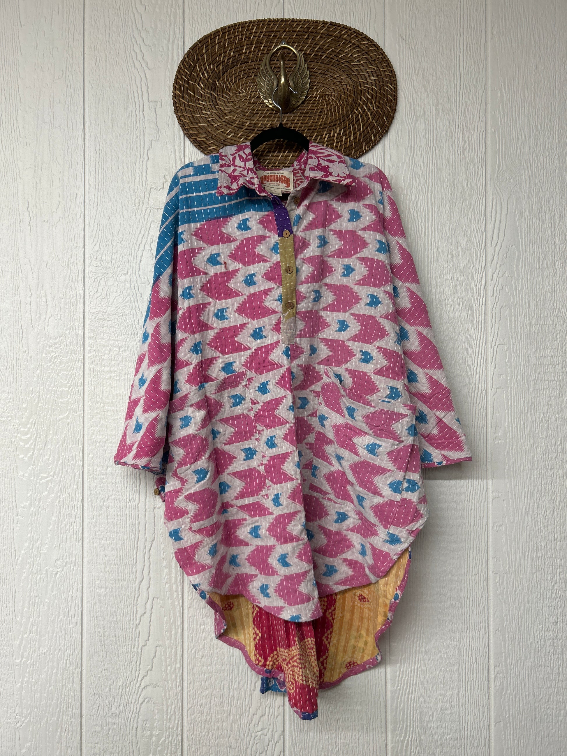 Made from our hand kantha stitched vintage cotton sari, this piece of wearable art features a henley neckline with functional buttons, slouchy outer pockets, billowy sleeves and a rounded hemline. The perfect top to compliment your favorite kantha pants or bell bottoms.