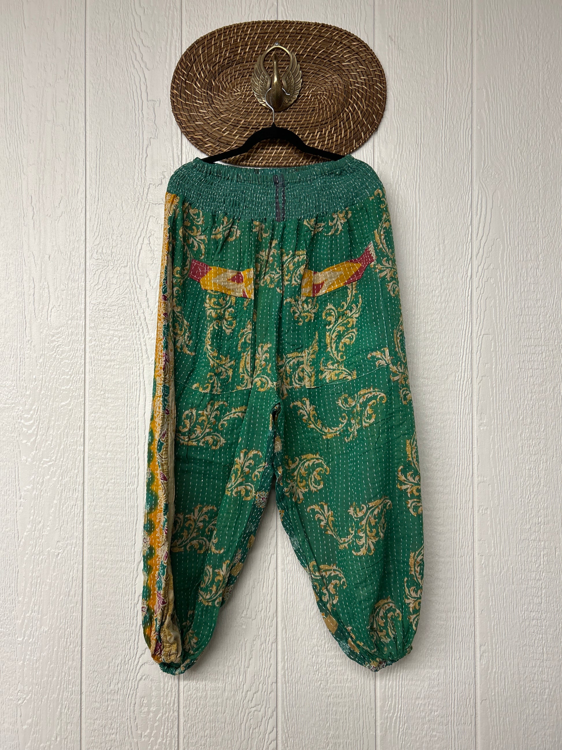Crafted from our ultra lux kantha stitched vintage cotton sari these pants feature exterior slouchy pockets, a stretchy waistband and an elastic ankle opening. Dress these dream pants up or down to become the ultimate vibe!