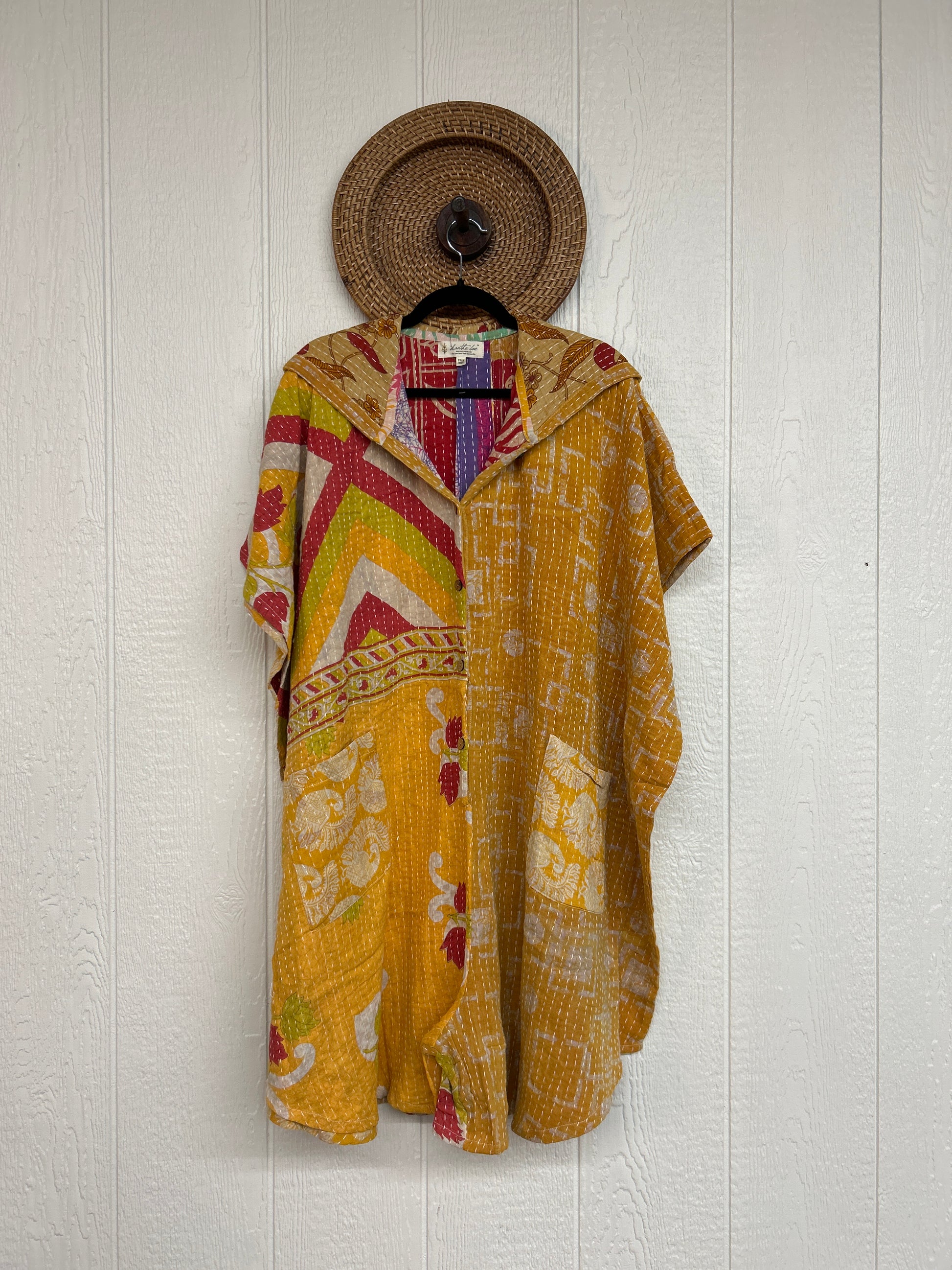Made from our hand Kantha stitched cotton sari, this one piece wonder features a hood, front button-down closure, pockets, and super flowy shorts. Size Recommended 00-20/22. Crafted and sewn by families in a small village in Northern India, providing work and a fair living.