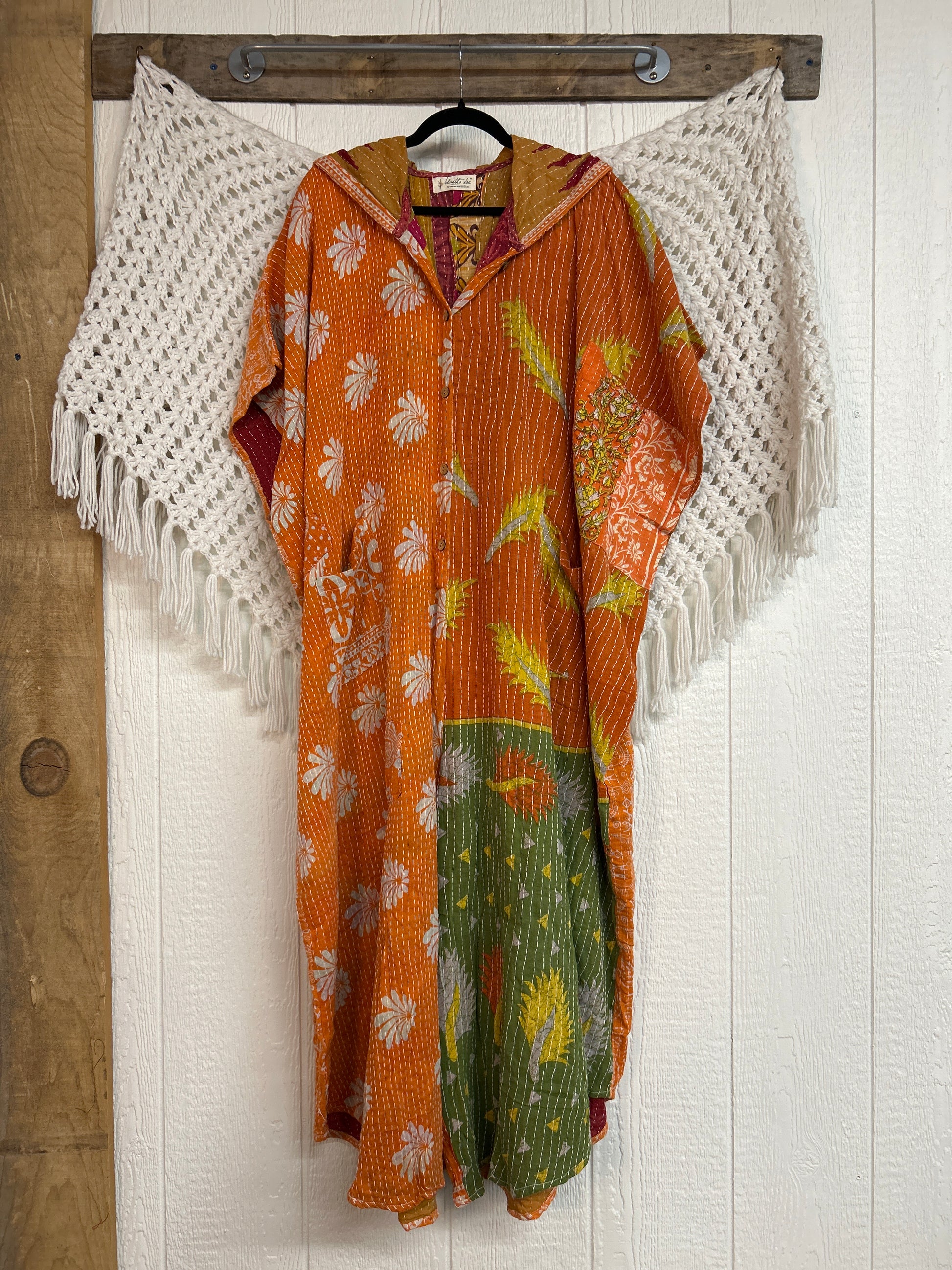 Made from our hand Kantha stitched cotton sari, this one piece wonder features a hood, front button-down closure, pockets, and super flowy pant legs..