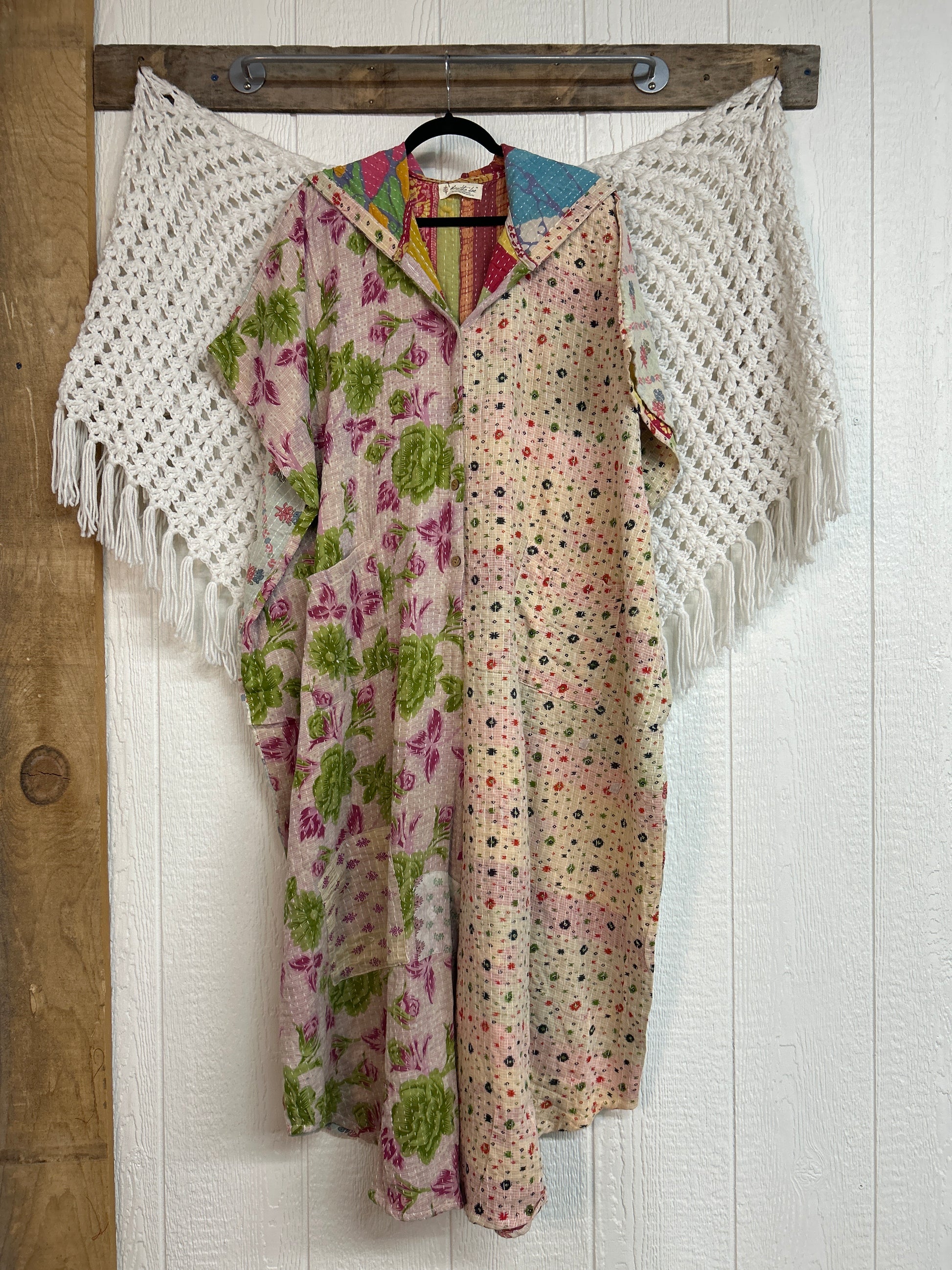 Made from our hand Kantha stitched cotton sari, this one piece wonder features a hood, front button-down closure, pockets, and super flowy pant legs..
