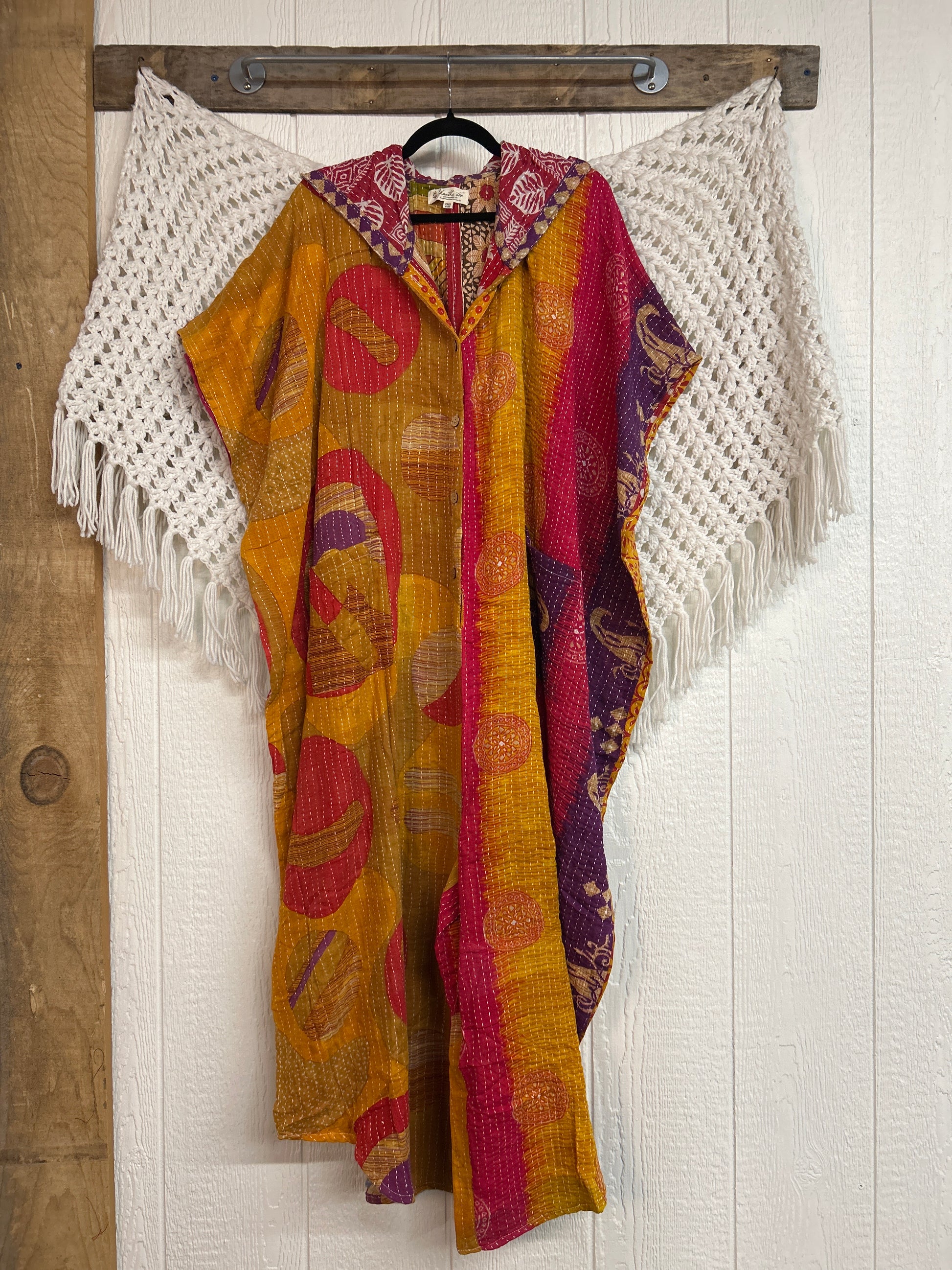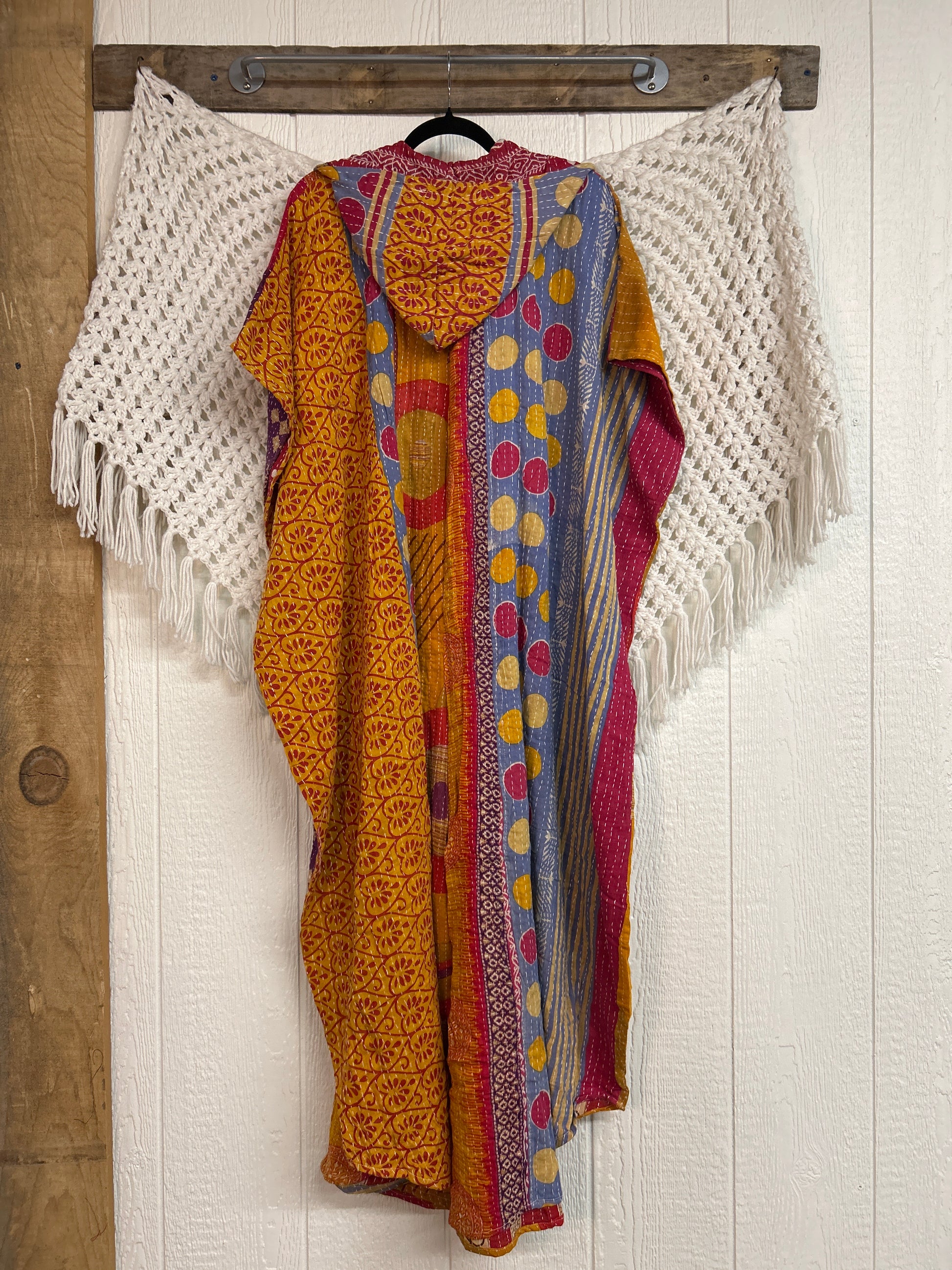 Made from our hand Kantha stitched cotton sari, this one piece wonder features a hood, front button-down closure, pockets, and super flowy pant legs..