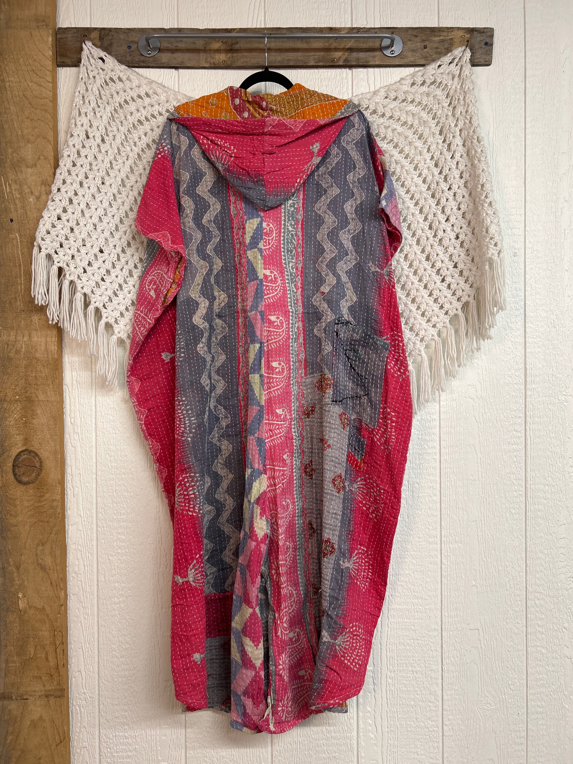 Made from our hand Kantha stitched cotton sari, this one piece wonder features a hood, front button-down closure, pockets, and super flowy pant legs..