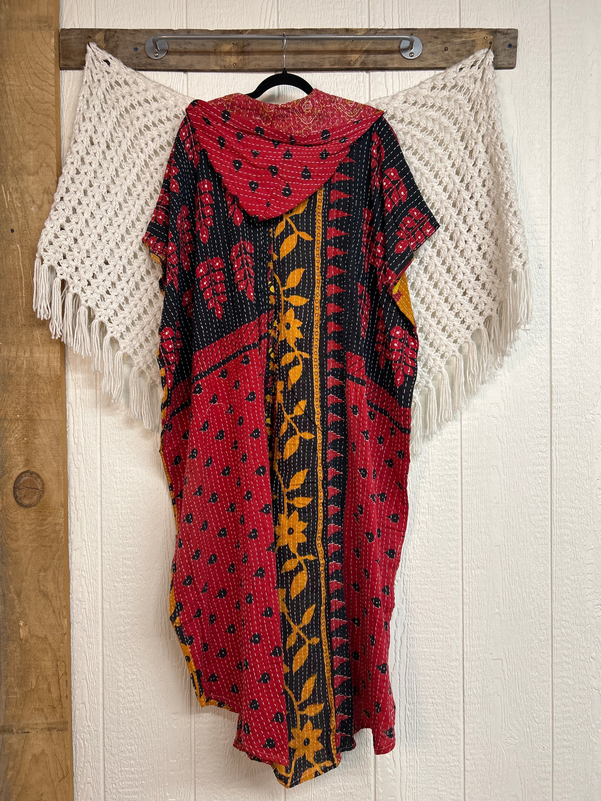 Made from our hand Kantha stitched cotton sari, this one piece wonder features a hood, front button-down closure, pockets, and super flowy pant legs..