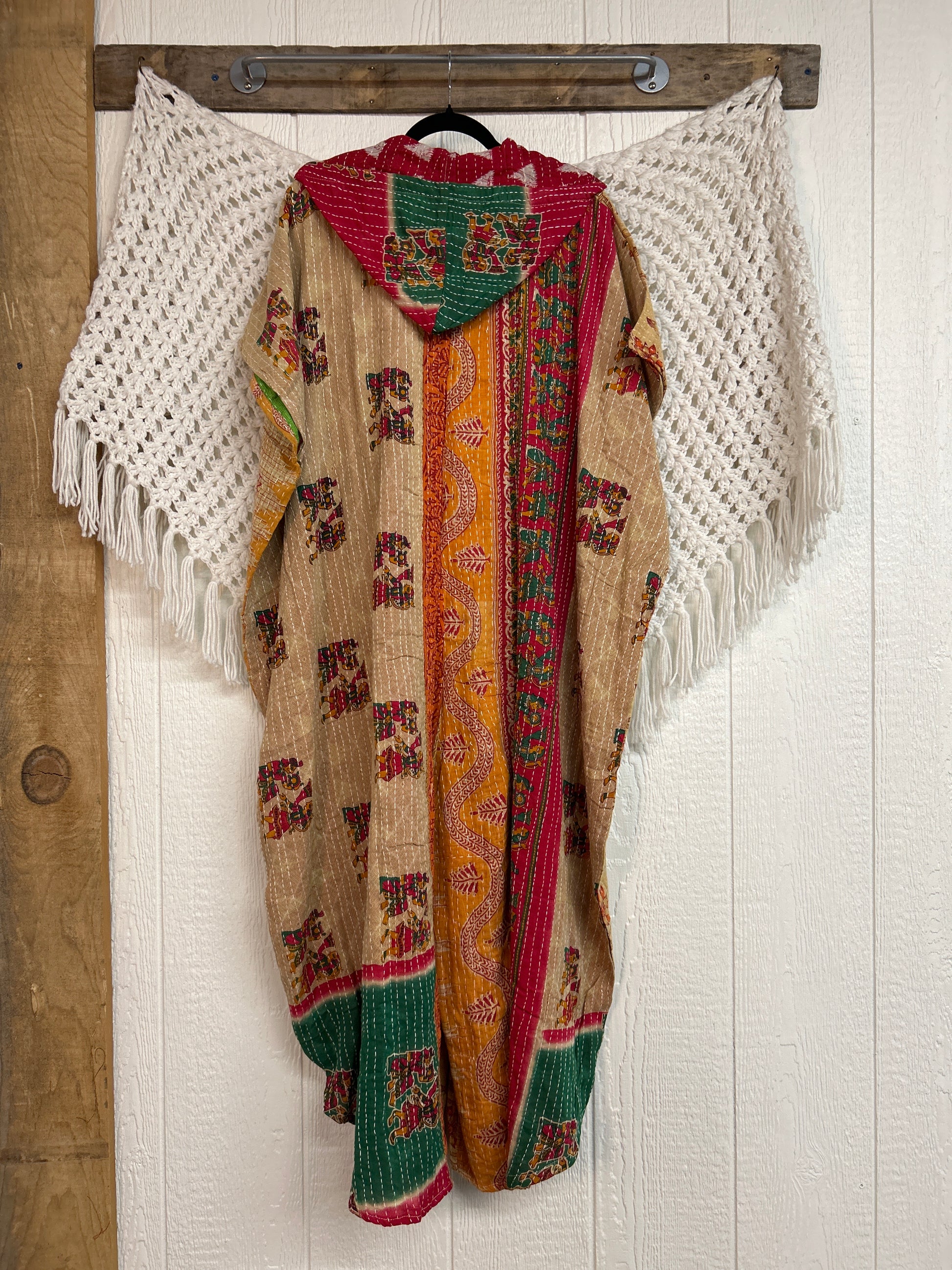 Made from our hand Kantha stitched cotton sari, this one piece wonder features a hood, front button-down closure, pockets, and super flowy pant legs..
