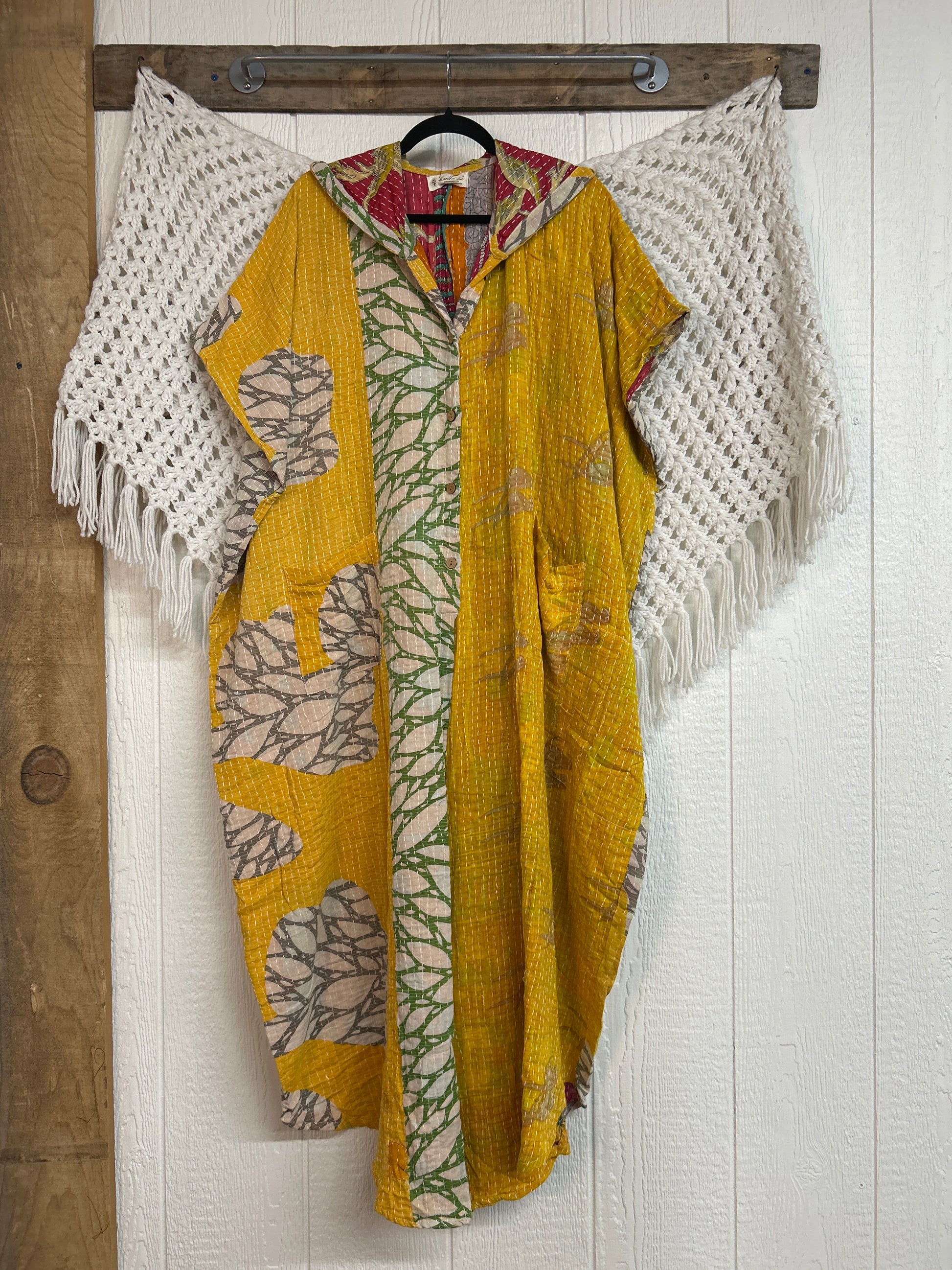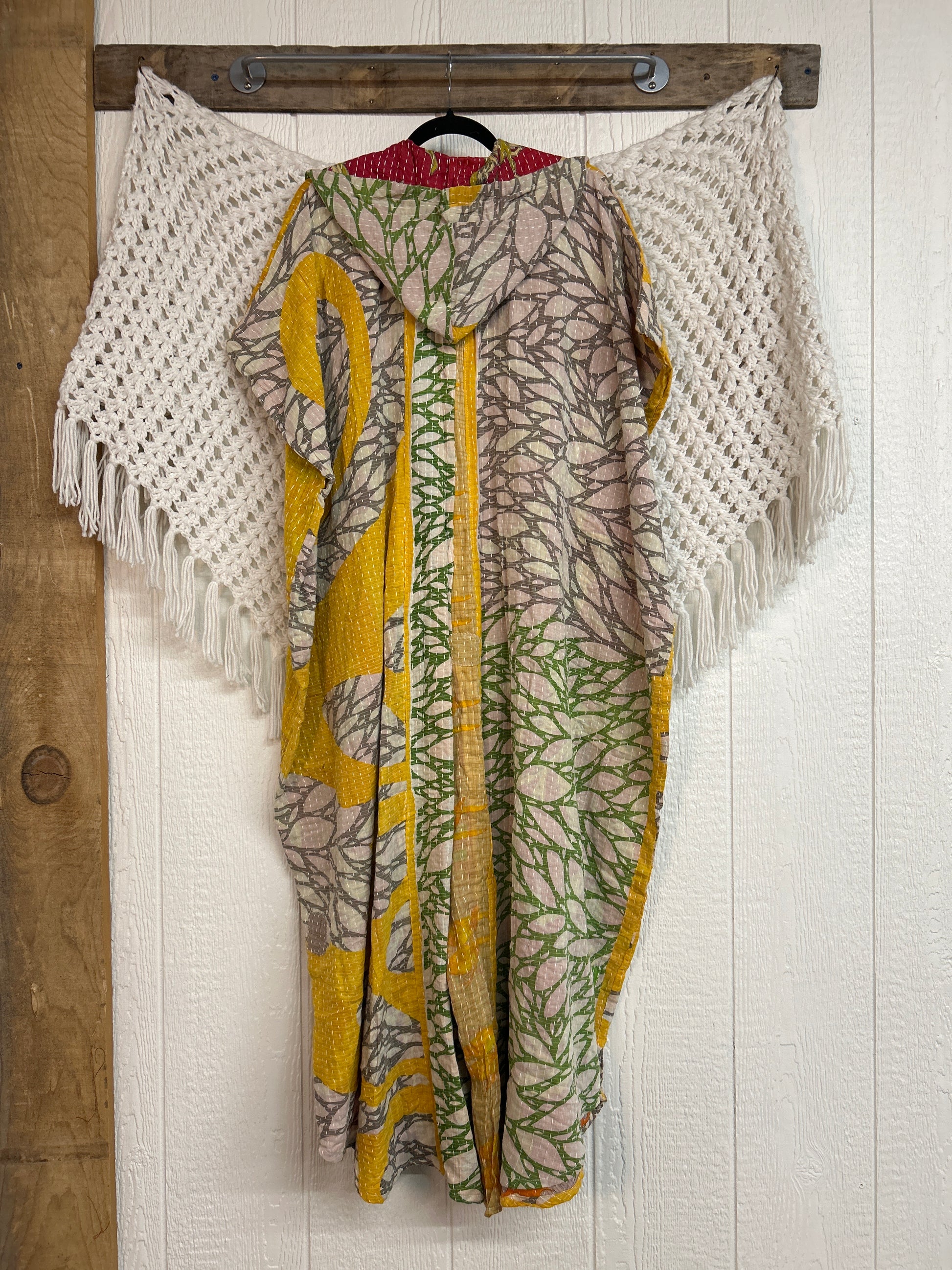 Made from our hand Kantha stitched cotton sari, this one piece wonder features a hood, front button-down closure, pockets, and super flowy pant legs..