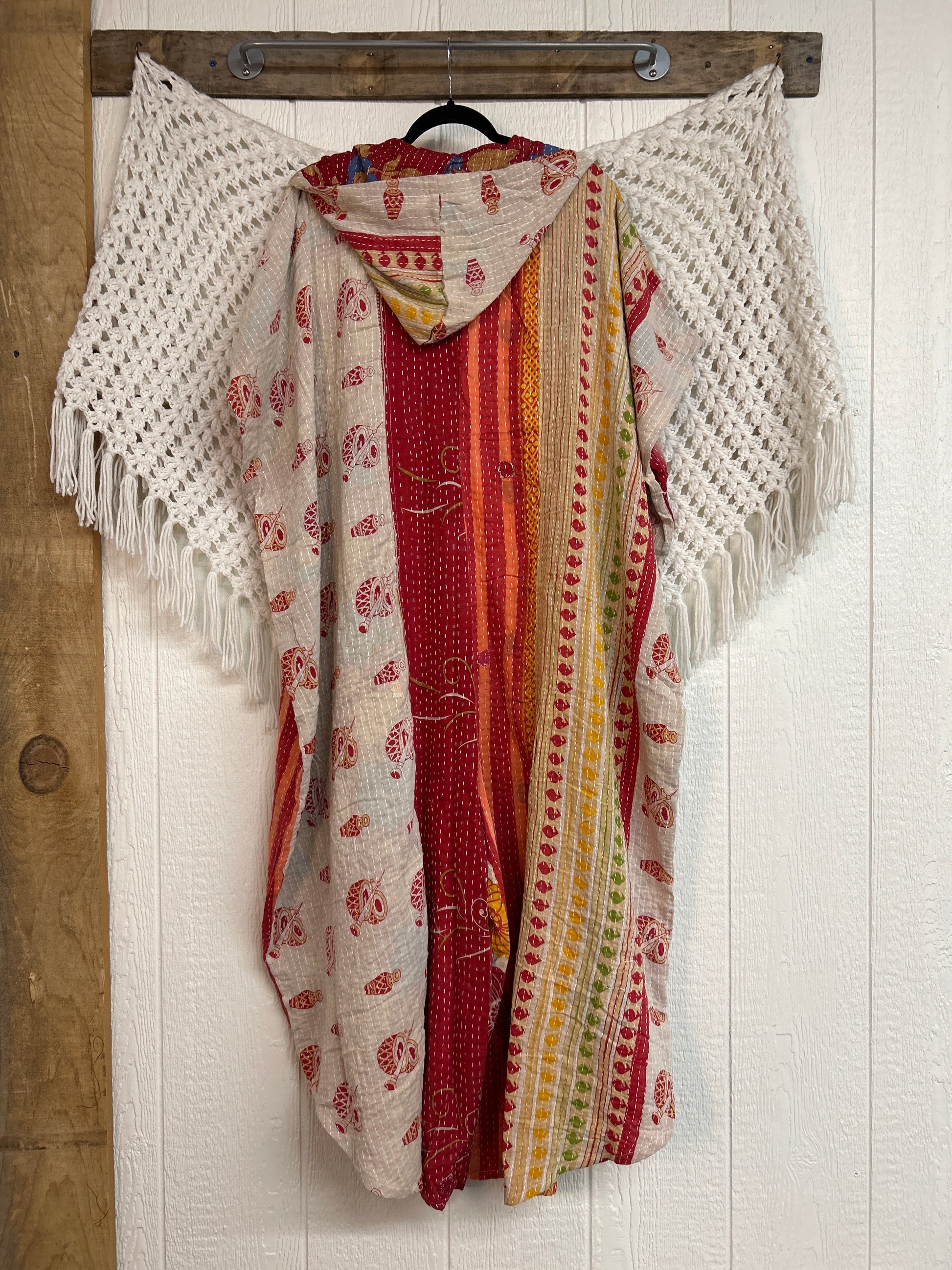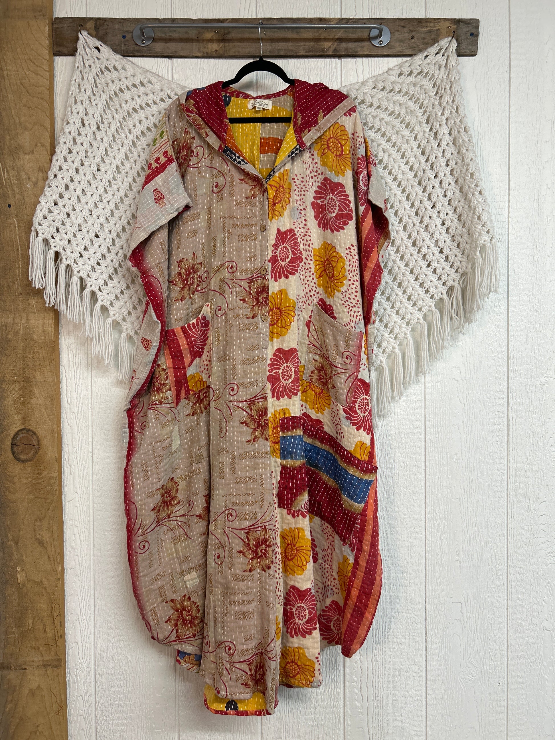 Made from our hand Kantha stitched cotton sari, this one piece wonder features a hood, front button-down closure, pockets, and super flowy pant legs..