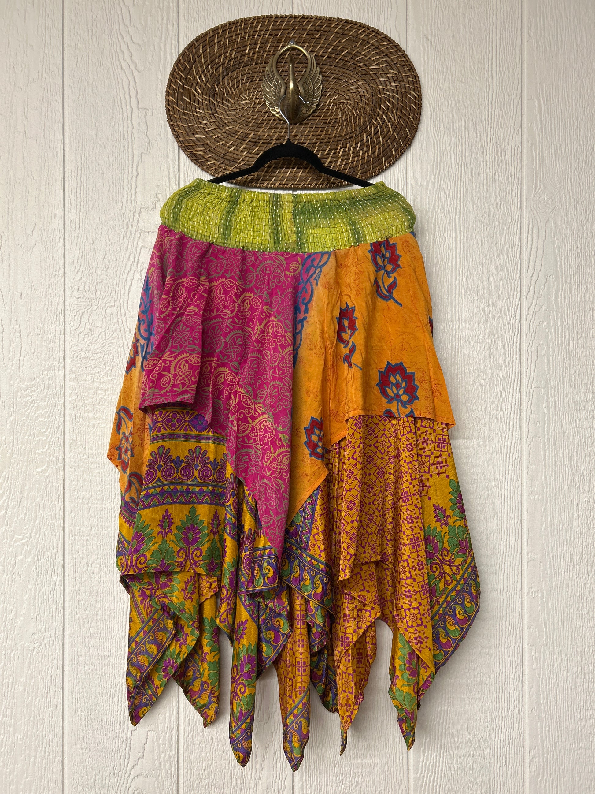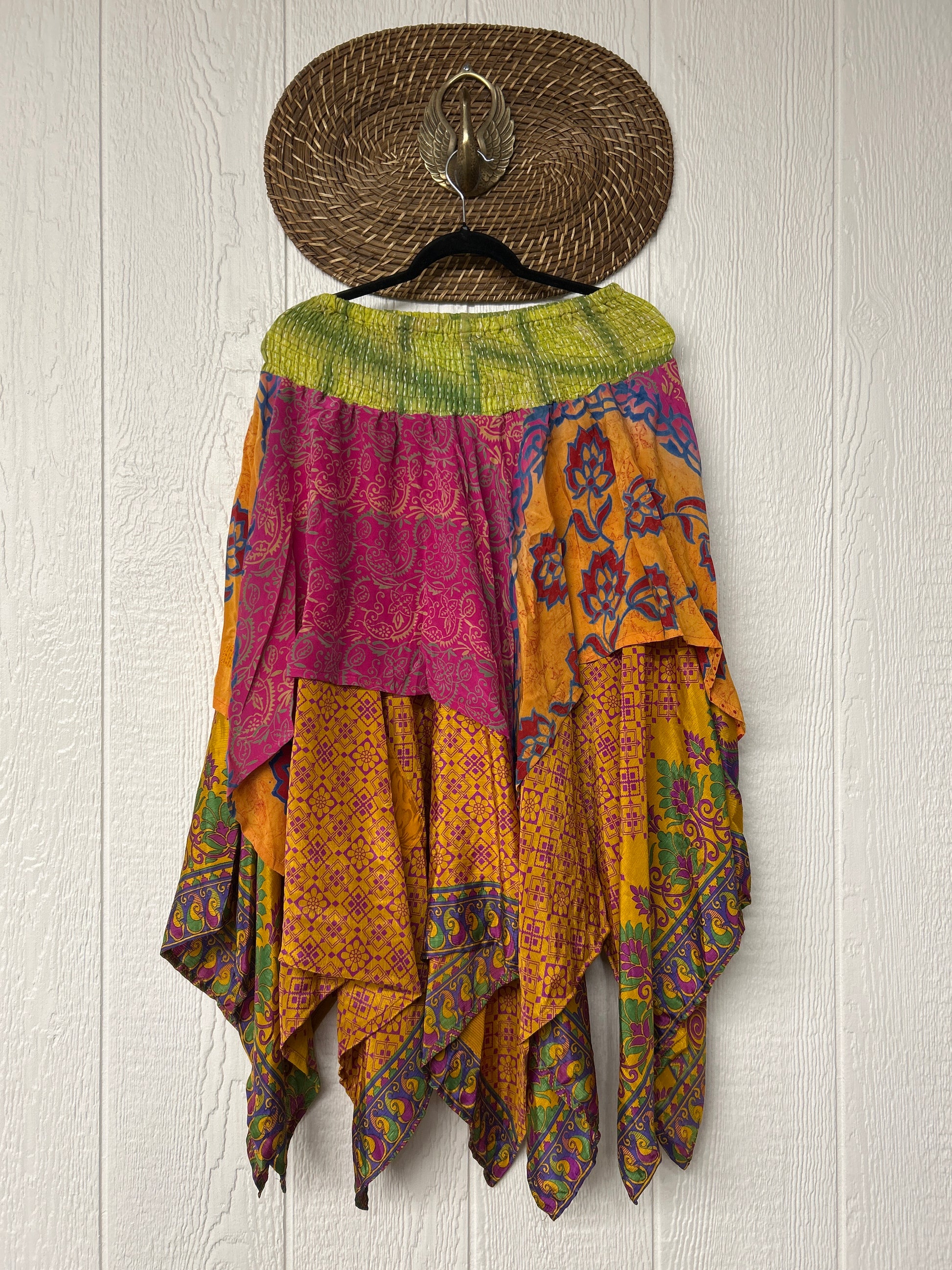 crafted from our ultra lux vintage crepe and ragulla sari. Features a rock star asymmetrical hem and stretchy pareo kantha waistband. This versatile piece can be pulled up to be worn as a tunic!