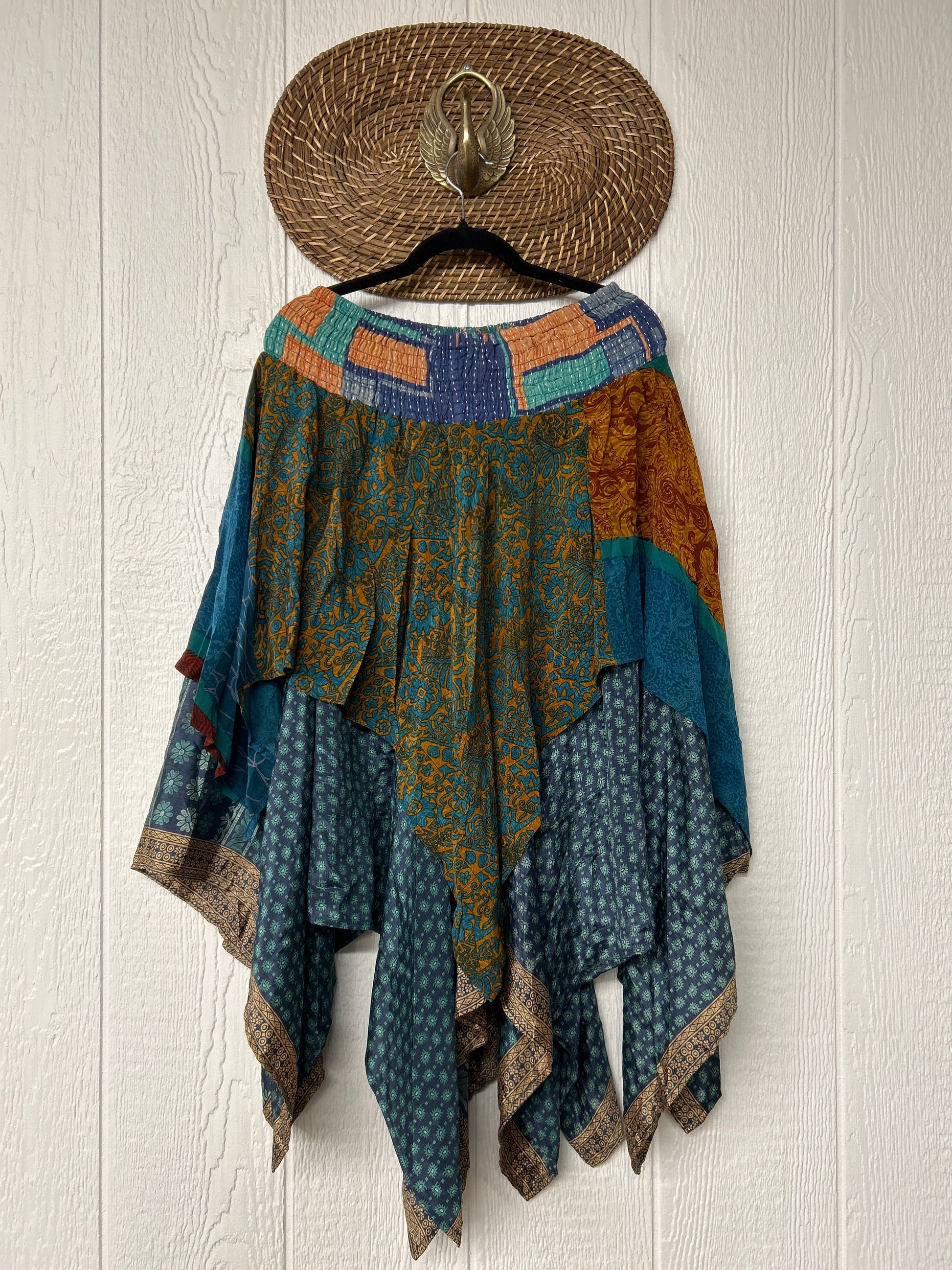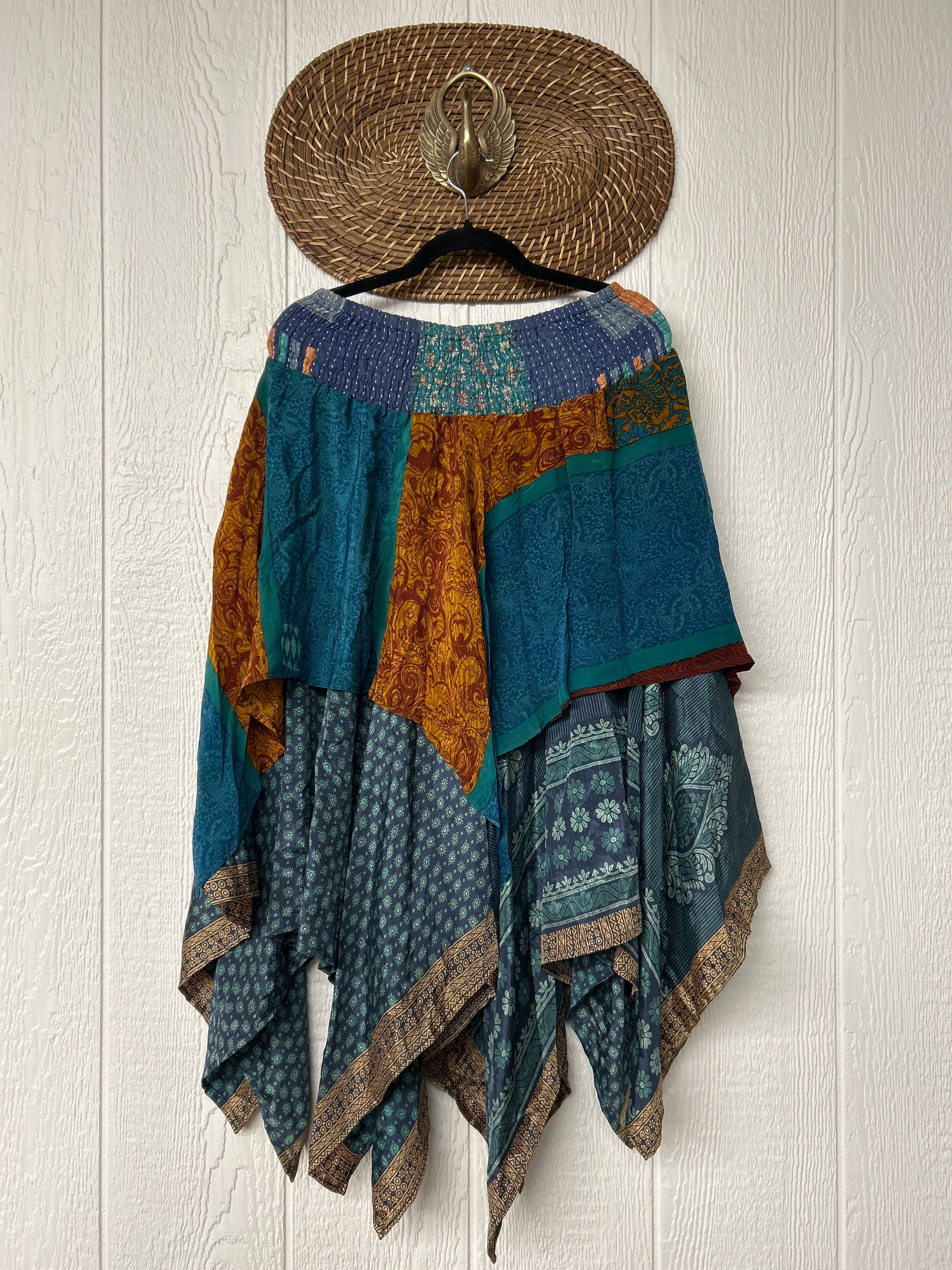 crafted from our ultra lux vintage crepe and ragulla sari. Features a rock star asymmetrical hem and stretchy pareo kantha waistband. This versatile piece can be pulled up to be worn as a tunic!
