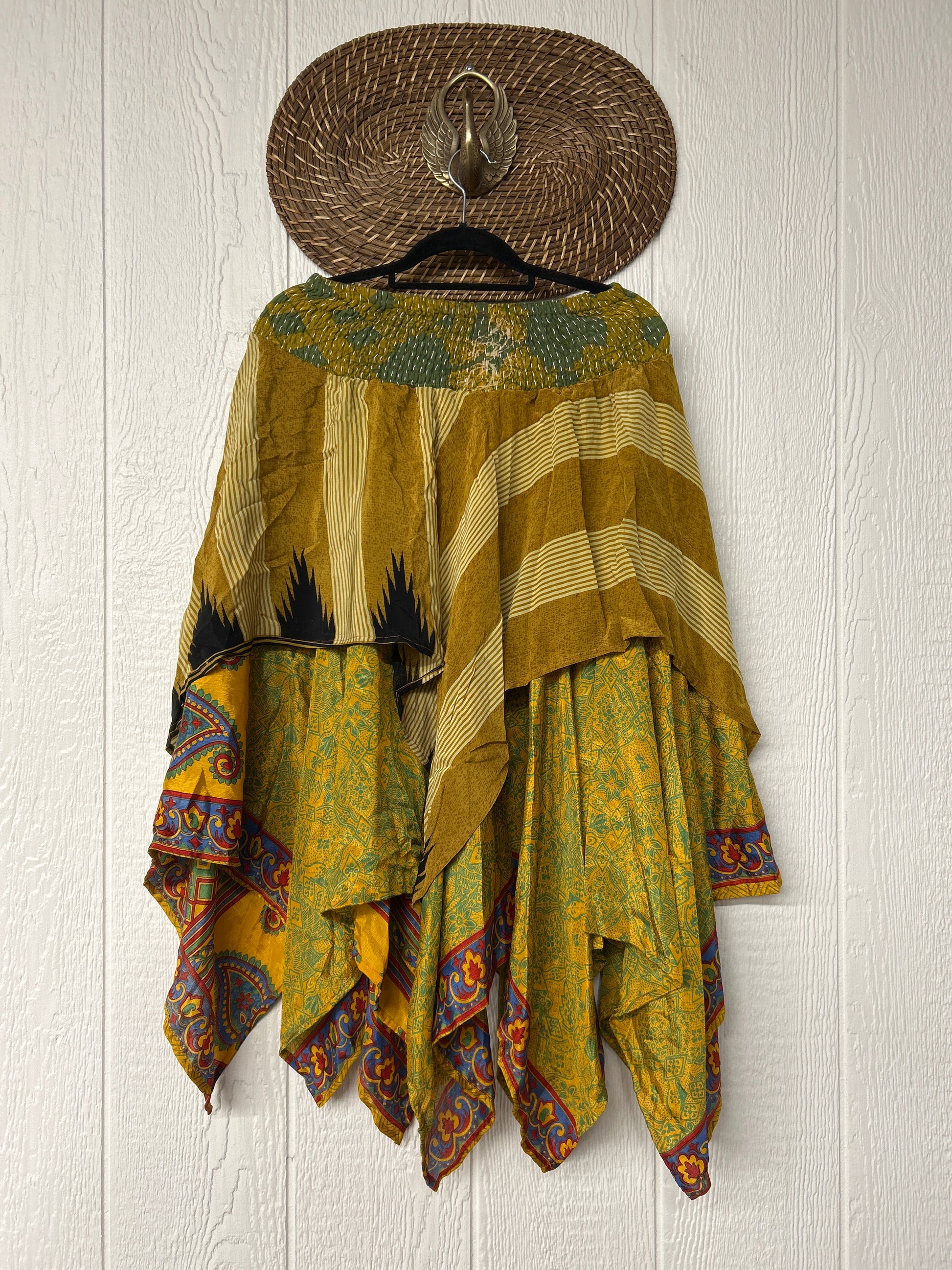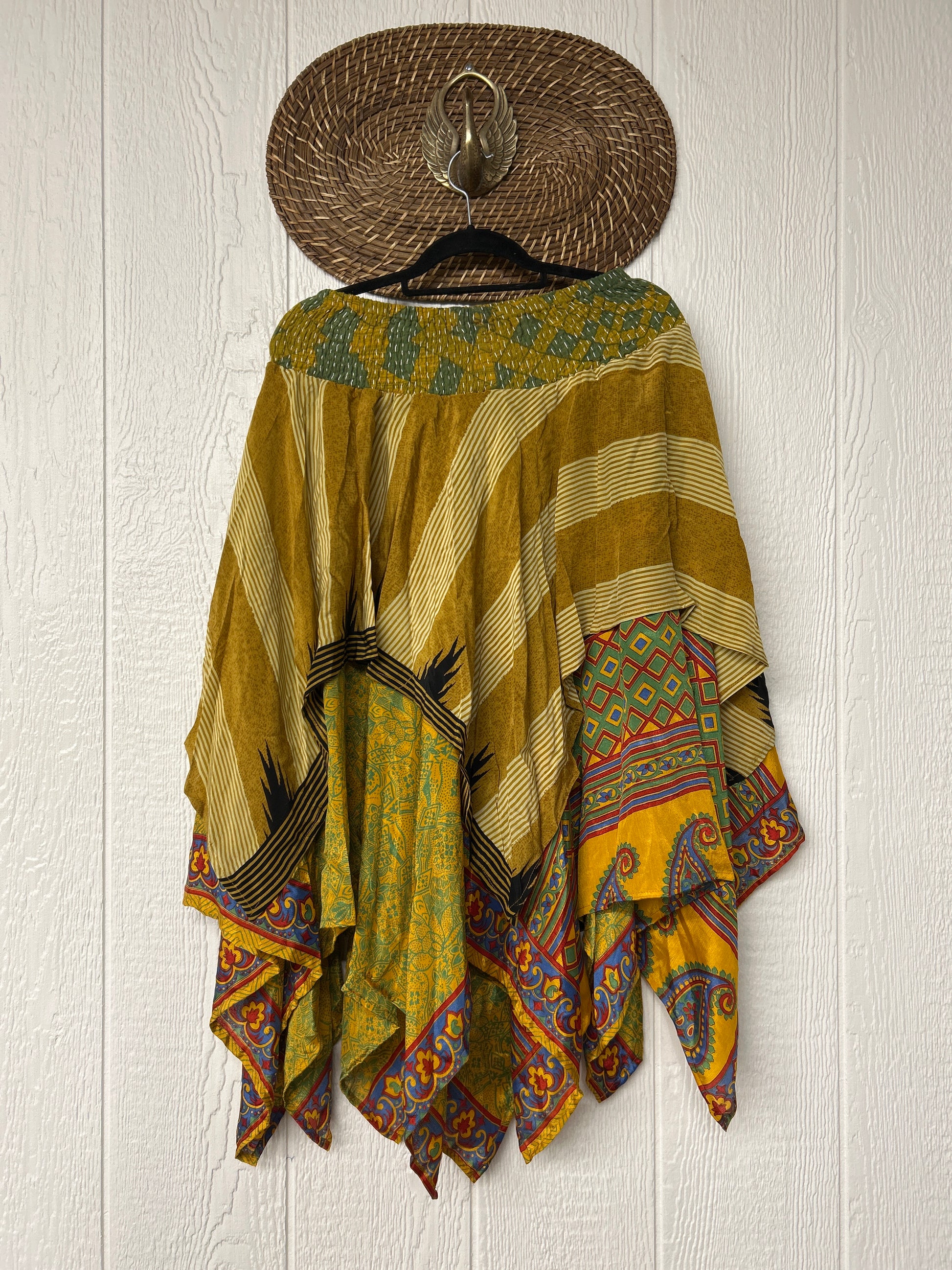 crafted from our ultra lux vintage crepe and ragulla sari. Features a rock star asymmetrical hem and stretchy pareo kantha waistband. This versatile piece can be pulled up to be worn as a tunic!