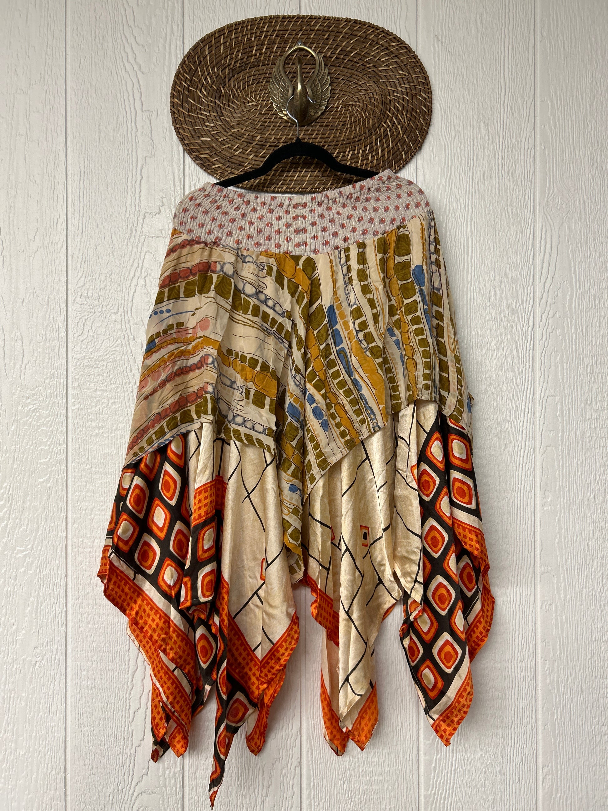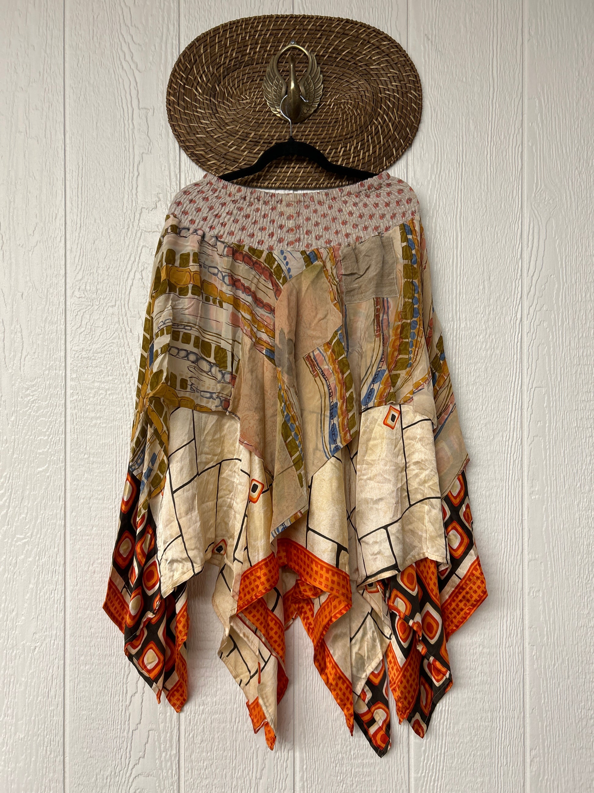 crafted from our ultra lux vintage crepe and ragulla sari. Features a rock star asymmetrical hem and stretchy pareo kantha waistband. This versatile piece can be pulled up to be worn as a tunic!
