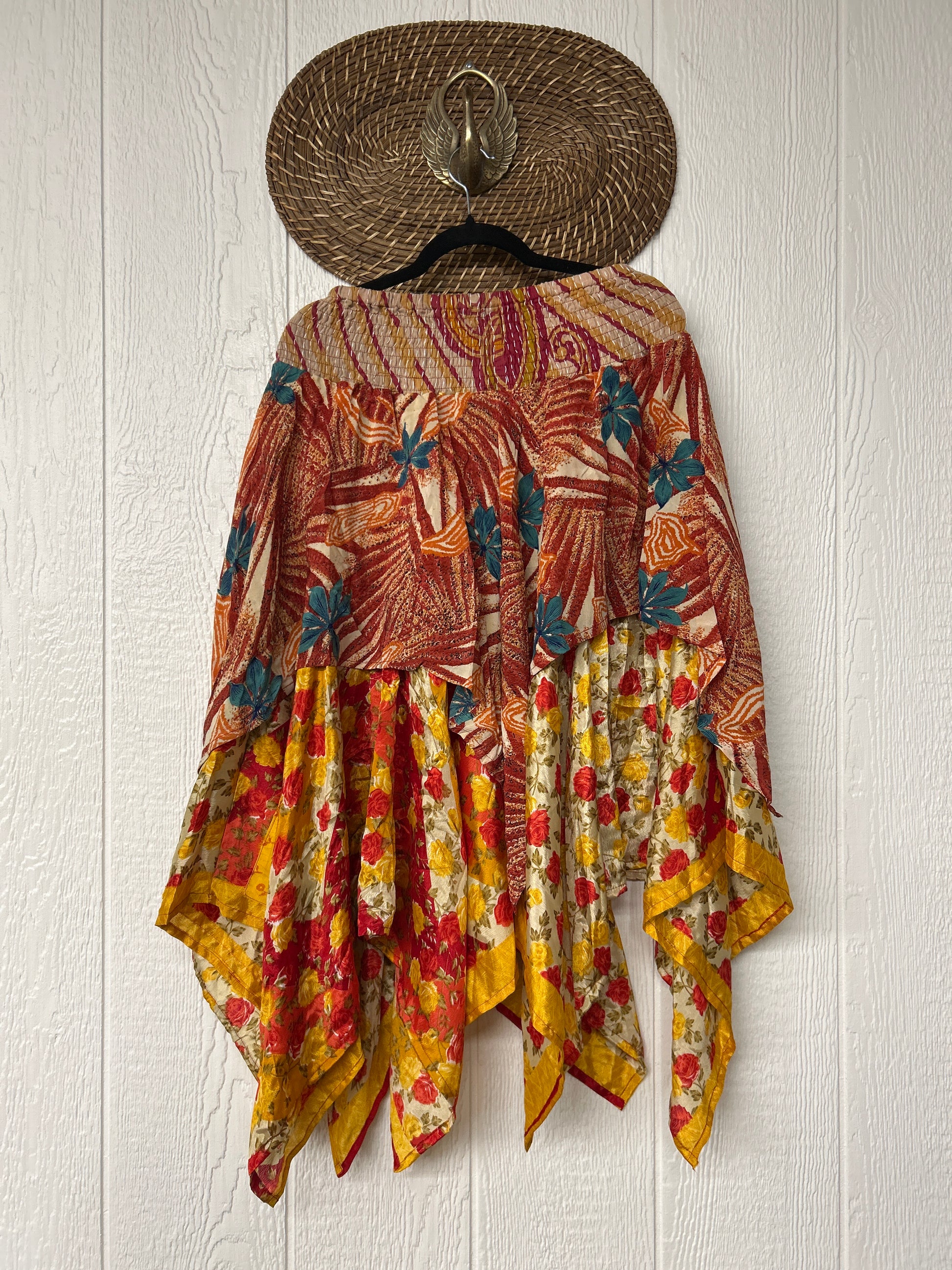 crafted from our ultra lux vintage crepe and ragulla sari. Features a rock star asymmetrical hem and stretchy pareo kantha waistband. This versatile piece can be pulled up to be worn as a tunic!