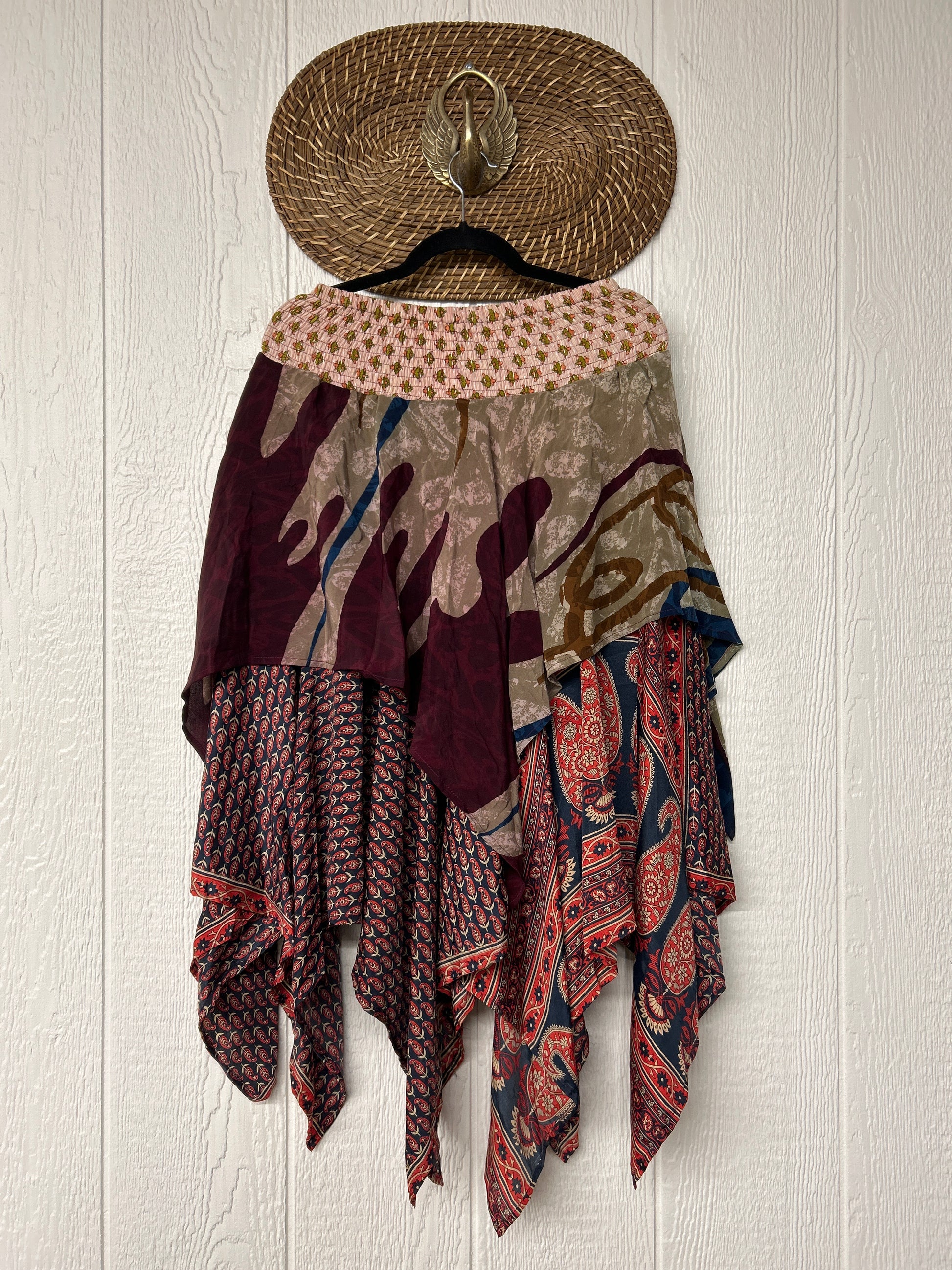 crafted from our ultra lux vintage crepe and ragulla sari. Features a rock star asymmetrical hem and stretchy pareo kantha waistband. This versatile piece can be pulled up to be worn as a tunic!