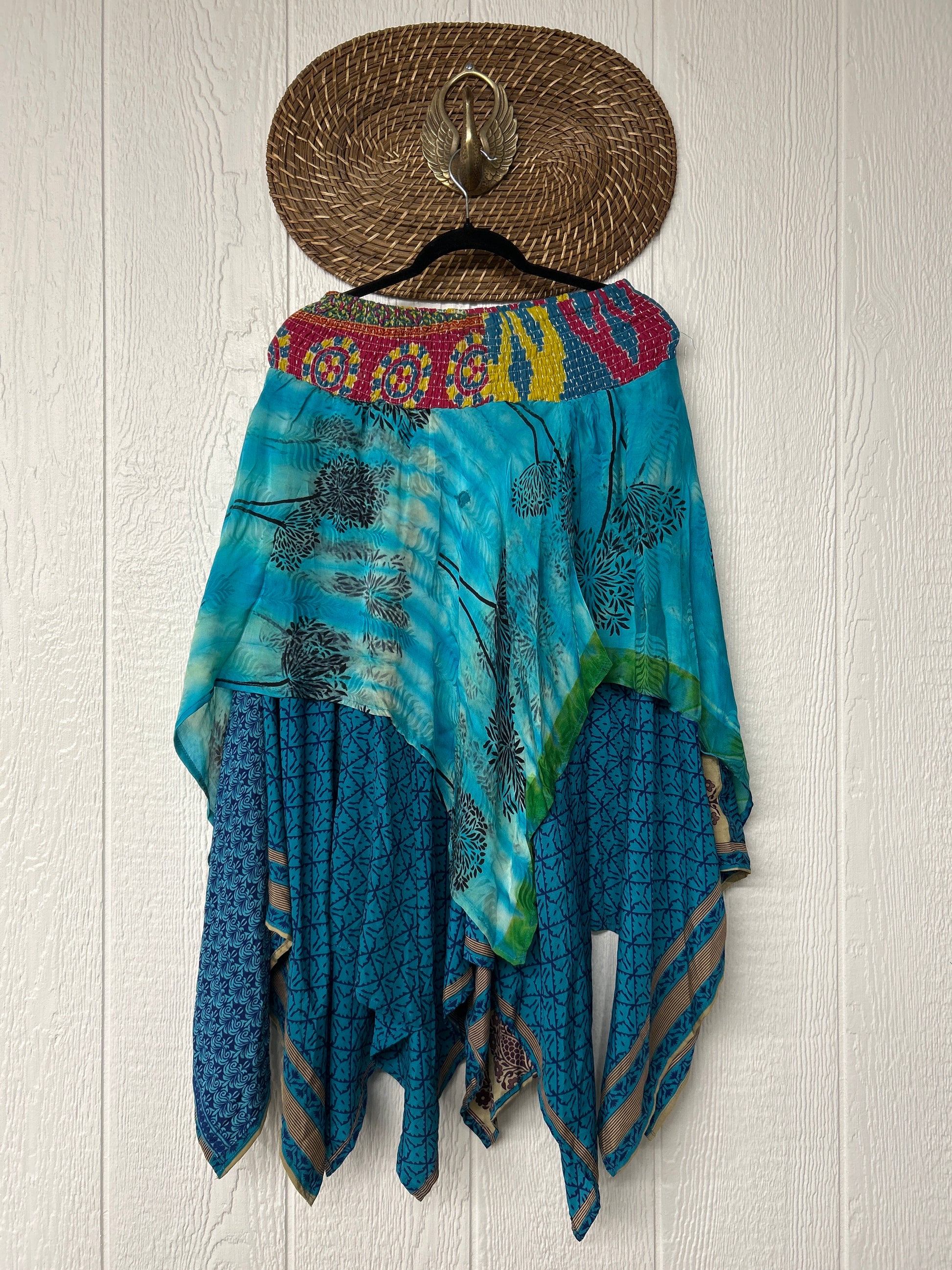 crafted from our ultra lux vintage crepe and ragulla sari. Features a rock star asymmetrical hem and stretchy pareo kantha waistband. This versatile piece can be pulled up to be worn as a tunic!