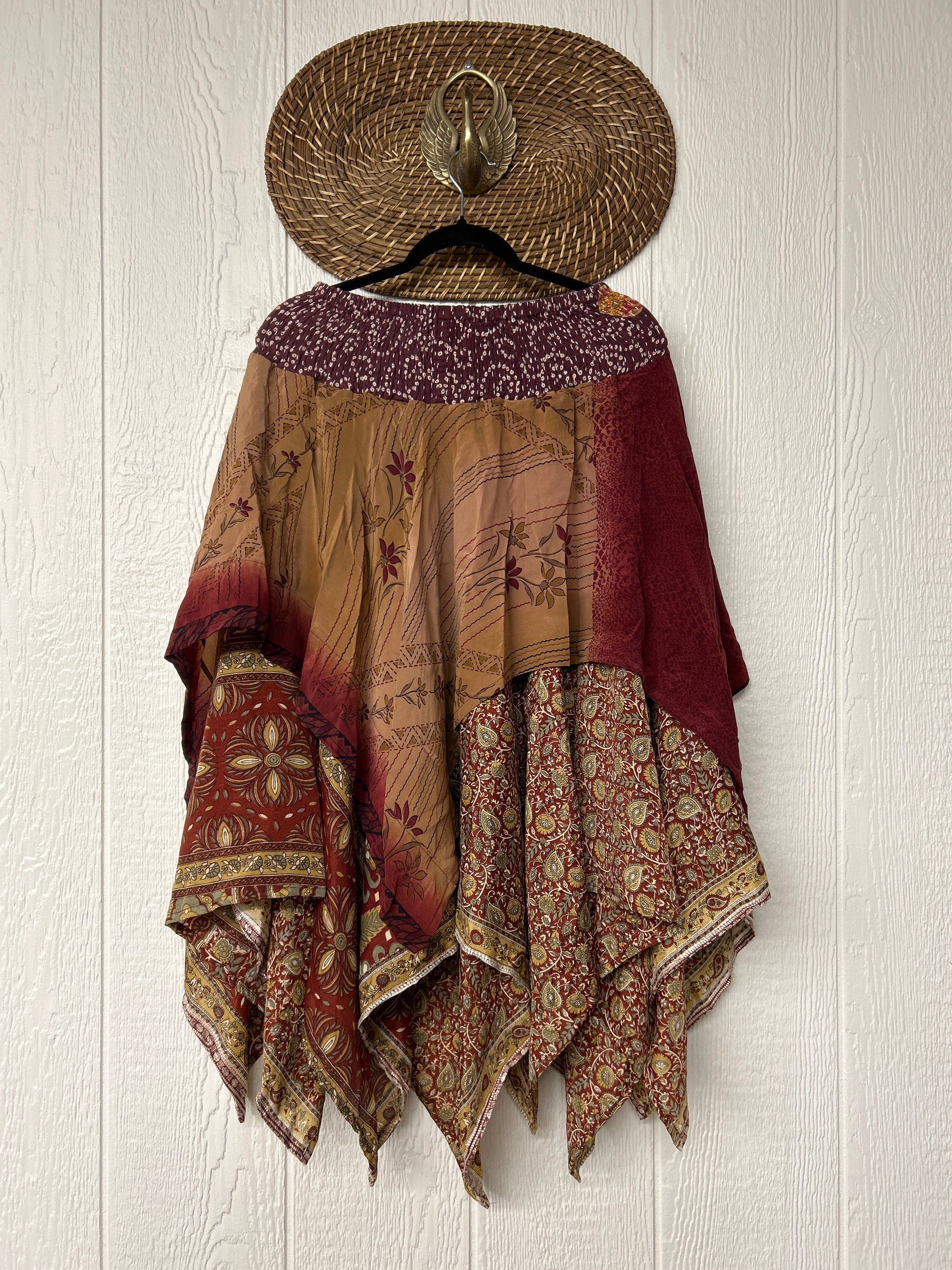 crafted from our ultra lux vintage crepe and ragulla sari. Features a rock star asymmetrical hem and stretchy pareo kantha waistband. This versatile piece can be pulled up to be worn as a tunic!