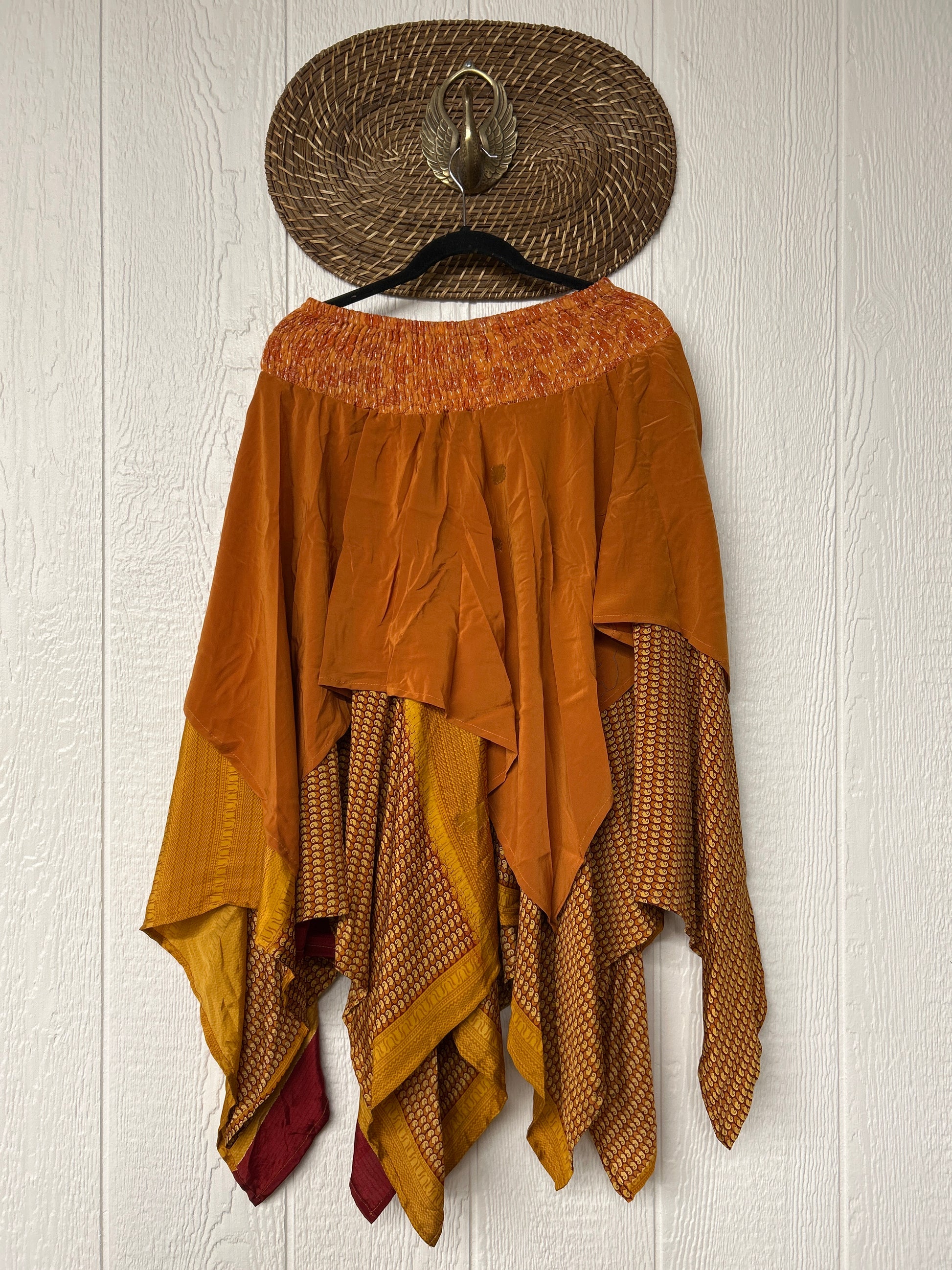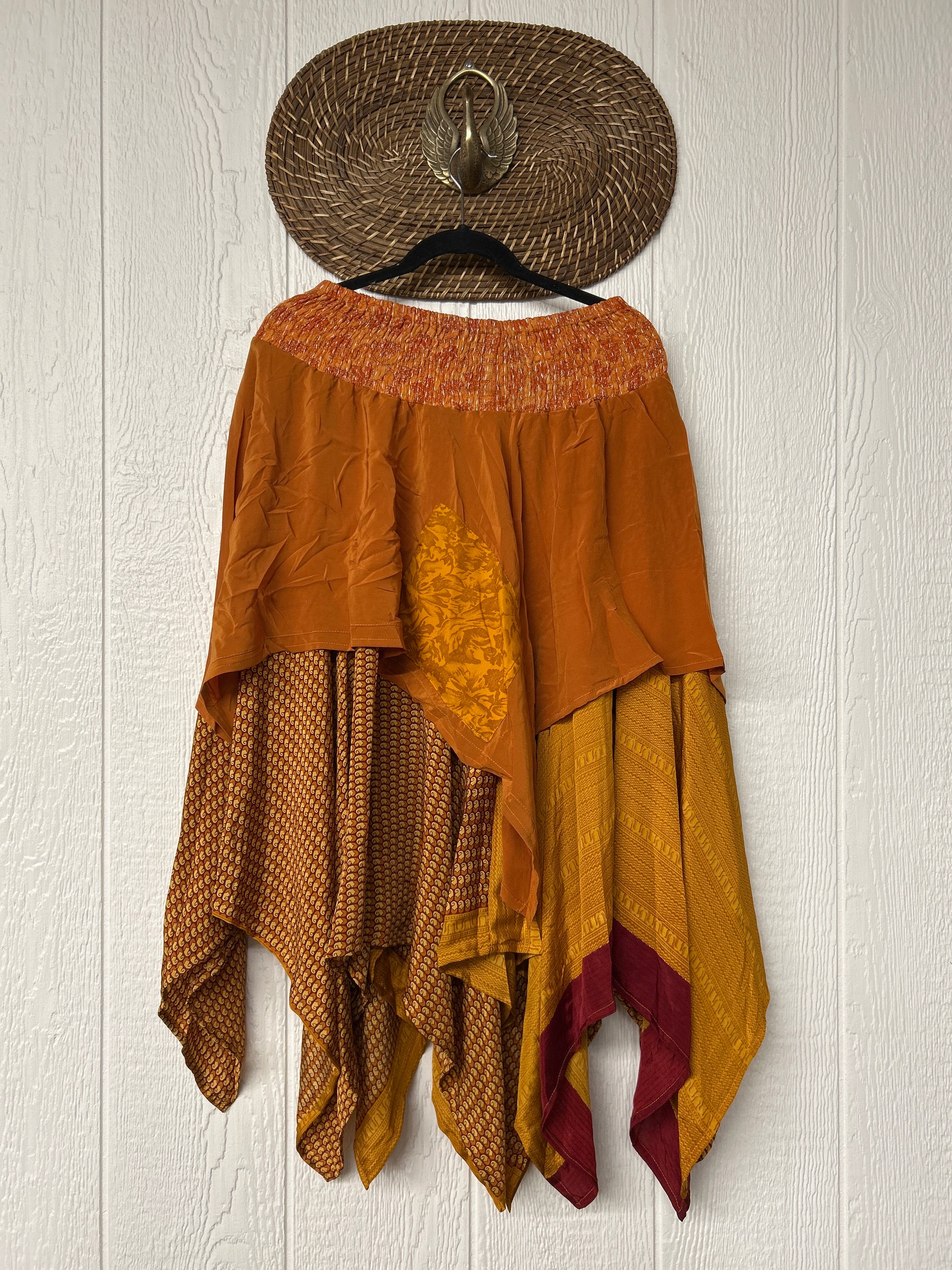 crafted from our ultra lux vintage crepe and ragulla sari. Features a rock star asymmetrical hem and stretchy pareo kantha waistband. This versatile piece can be pulled up to be worn as a tunic!
