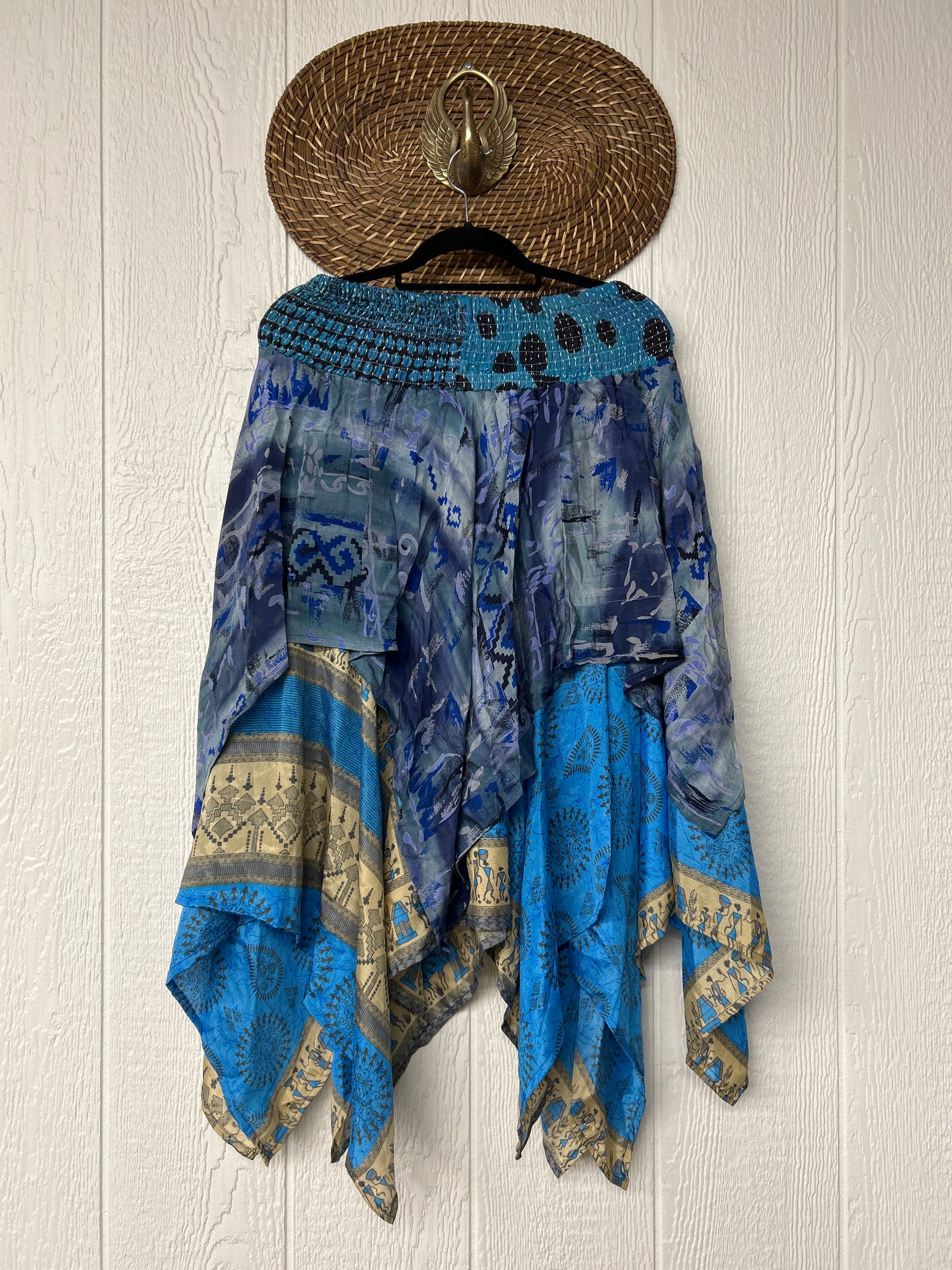 crafted from our ultra lux vintage crepe and ragulla sari. Features a rock star asymmetrical hem and stretchy pareo kantha waistband. This versatile piece can be pulled up to be worn as a tunic!