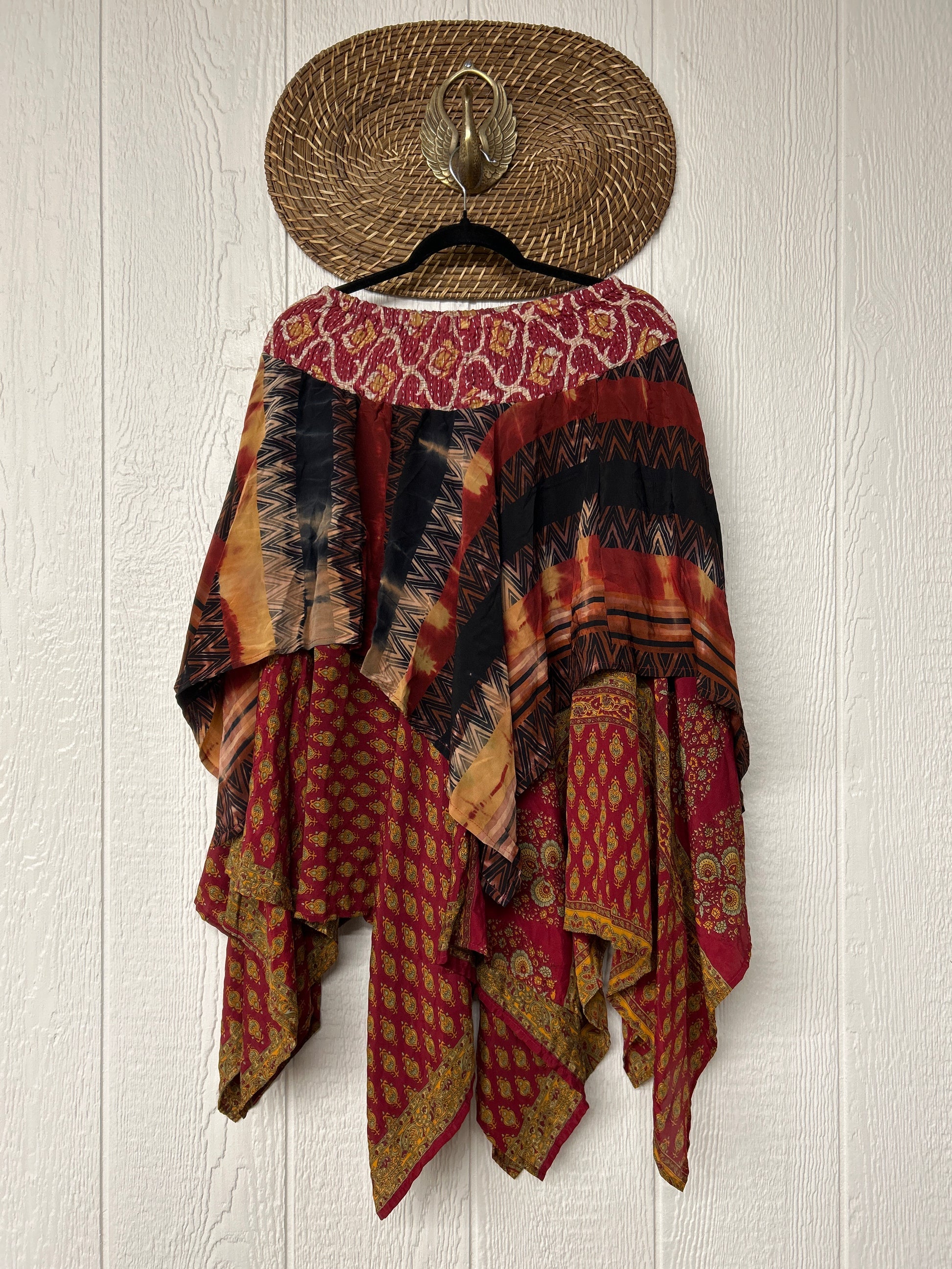 crafted from our ultra lux vintage crepe and ragulla sari. Features a rock star asymmetrical hem and stretchy pareo kantha waistband. This versatile piece can be pulled up to be worn as a tunic!