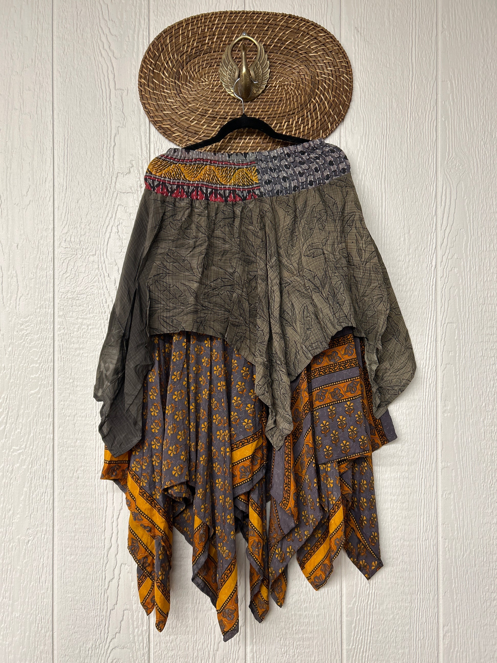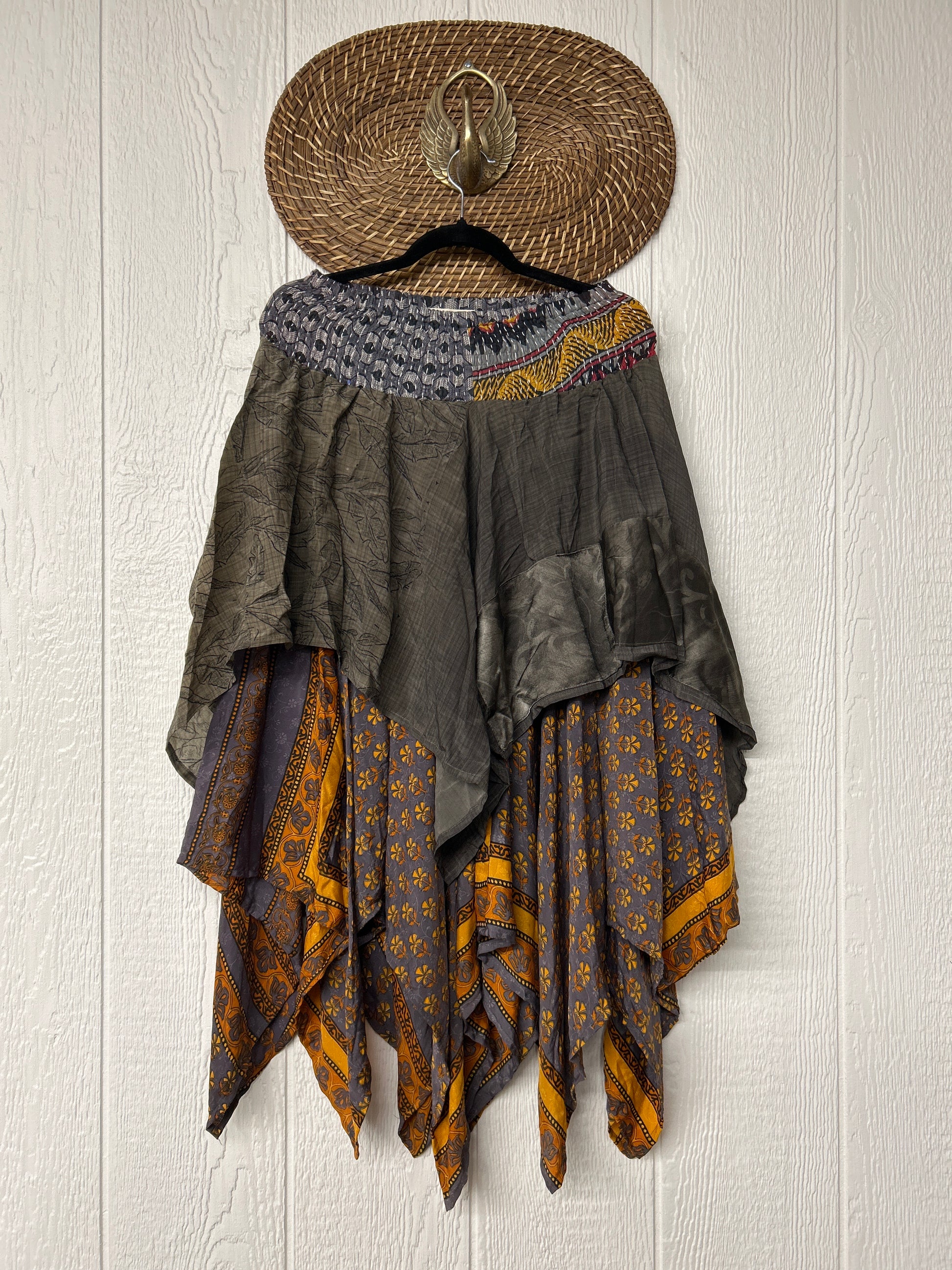 crafted from our ultra lux vintage crepe and ragulla sari. Features a rock star asymmetrical hem and stretchy pareo kantha waistband. This versatile piece can be pulled up to be worn as a tunic!