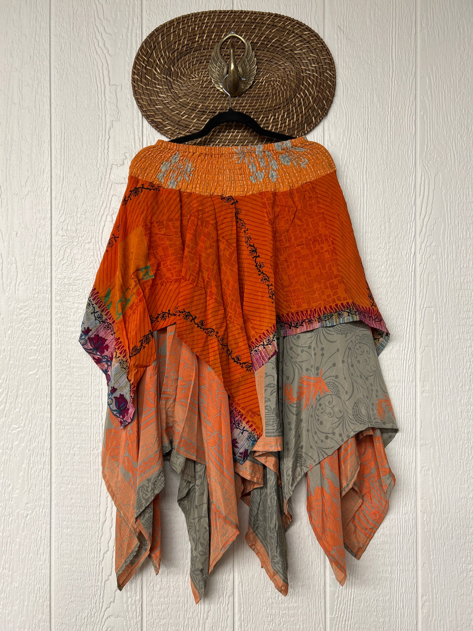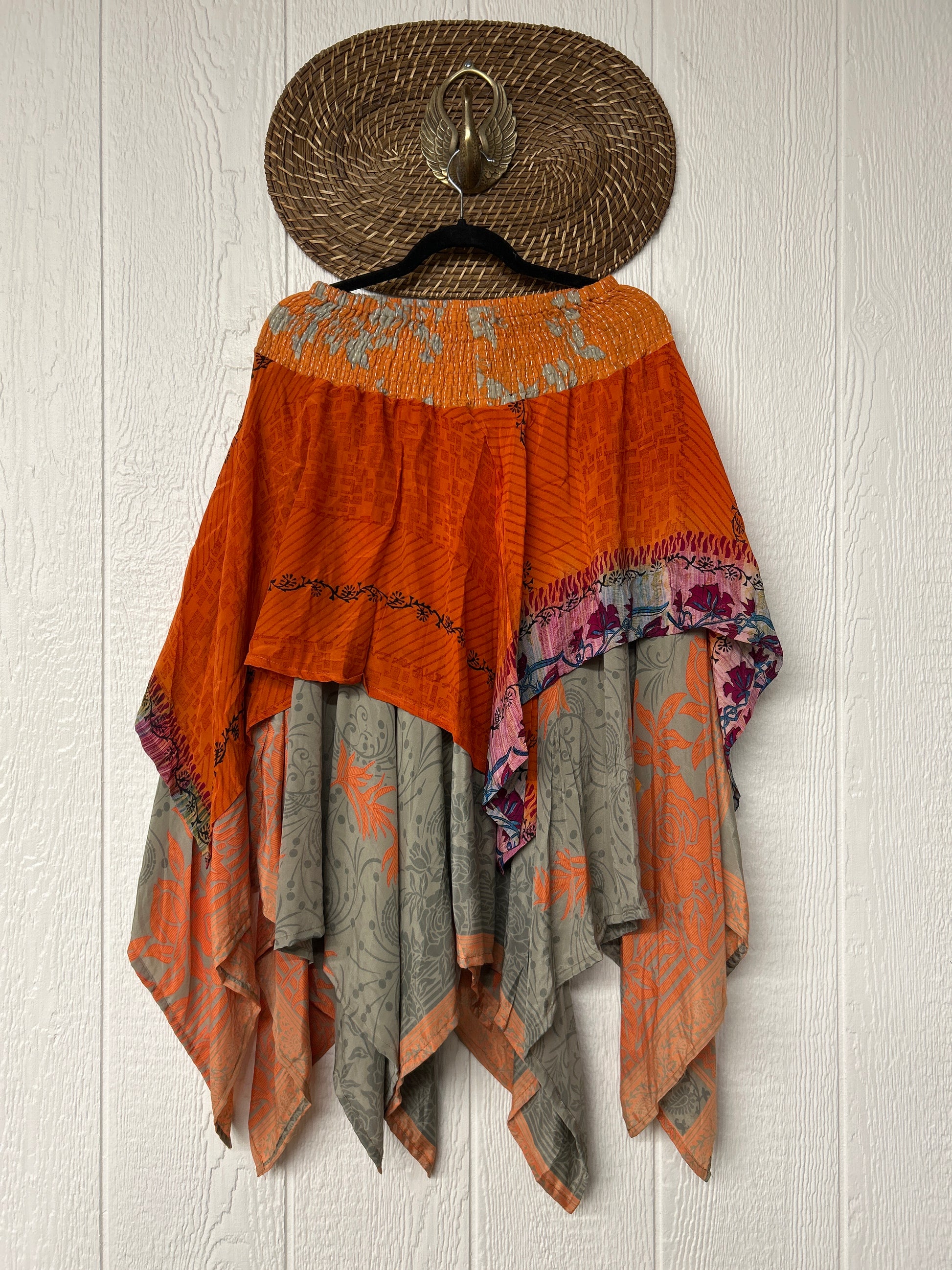crafted from our ultra lux vintage crepe and ragulla sari. Features a rock star asymmetrical hem and stretchy pareo kantha waistband. This versatile piece can be pulled up to be worn as a tunic!