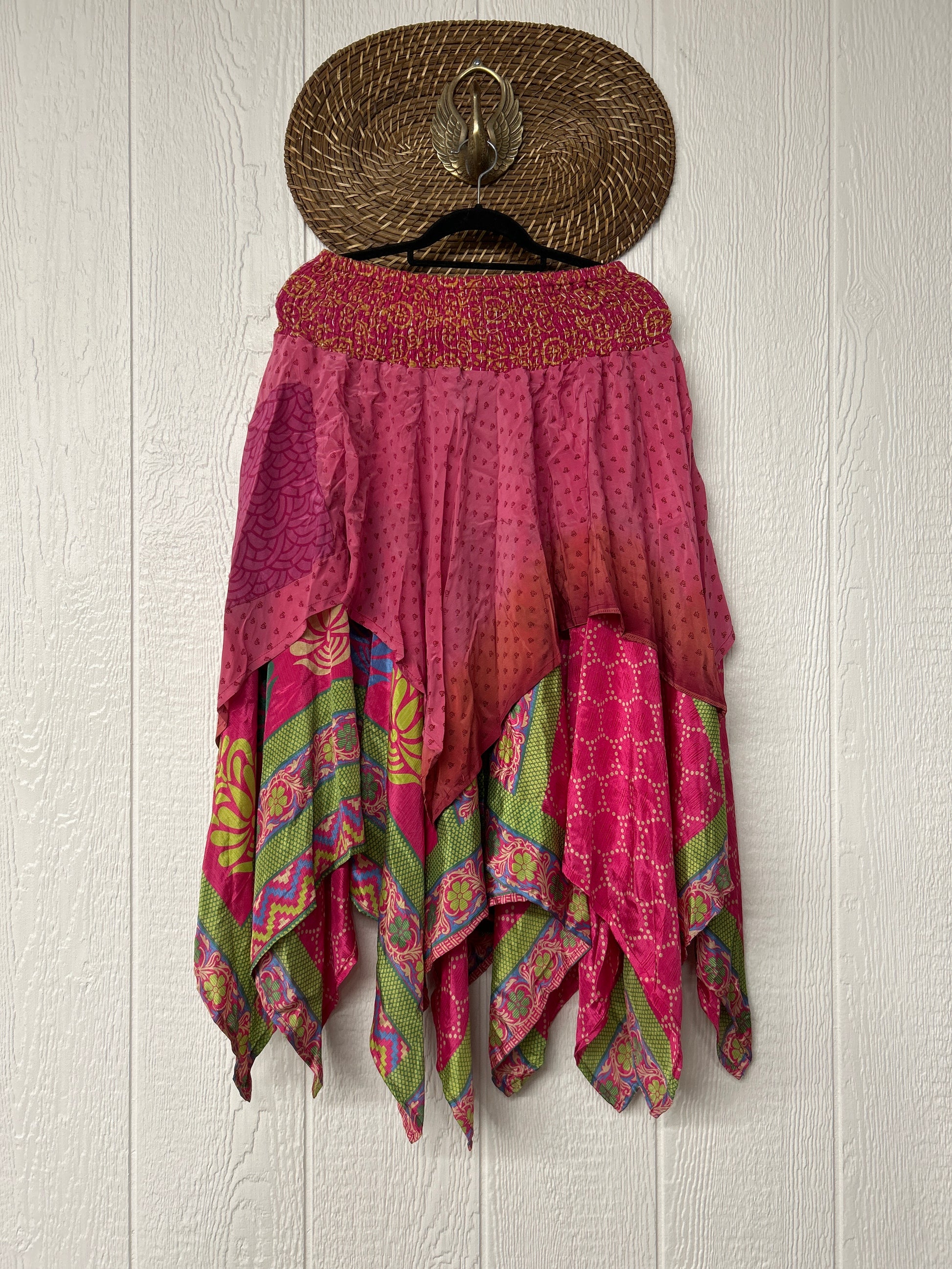 crafted from our ultra lux vintage crepe and ragulla sari. Features a rock star asymmetrical hem and stretchy pareo kantha waistband. This versatile piece can be pulled up to be worn as a tunic!