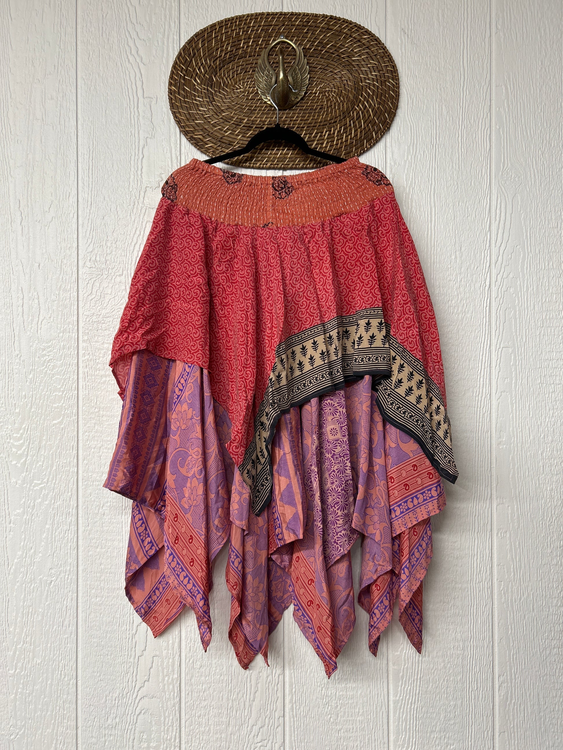 crafted from our ultra lux vintage crepe and ragulla sari. Features a rock star asymmetrical hem and stretchy pareo kantha waistband. This versatile piece can be pulled up to be worn as a tunic!