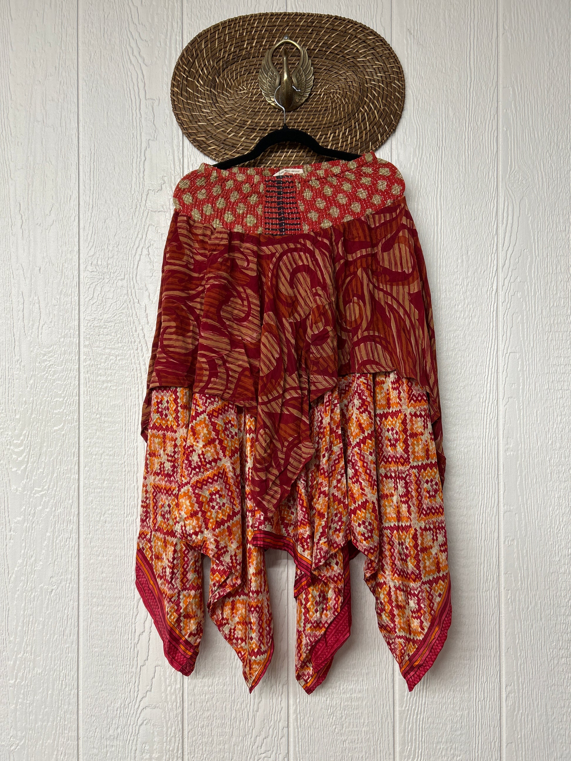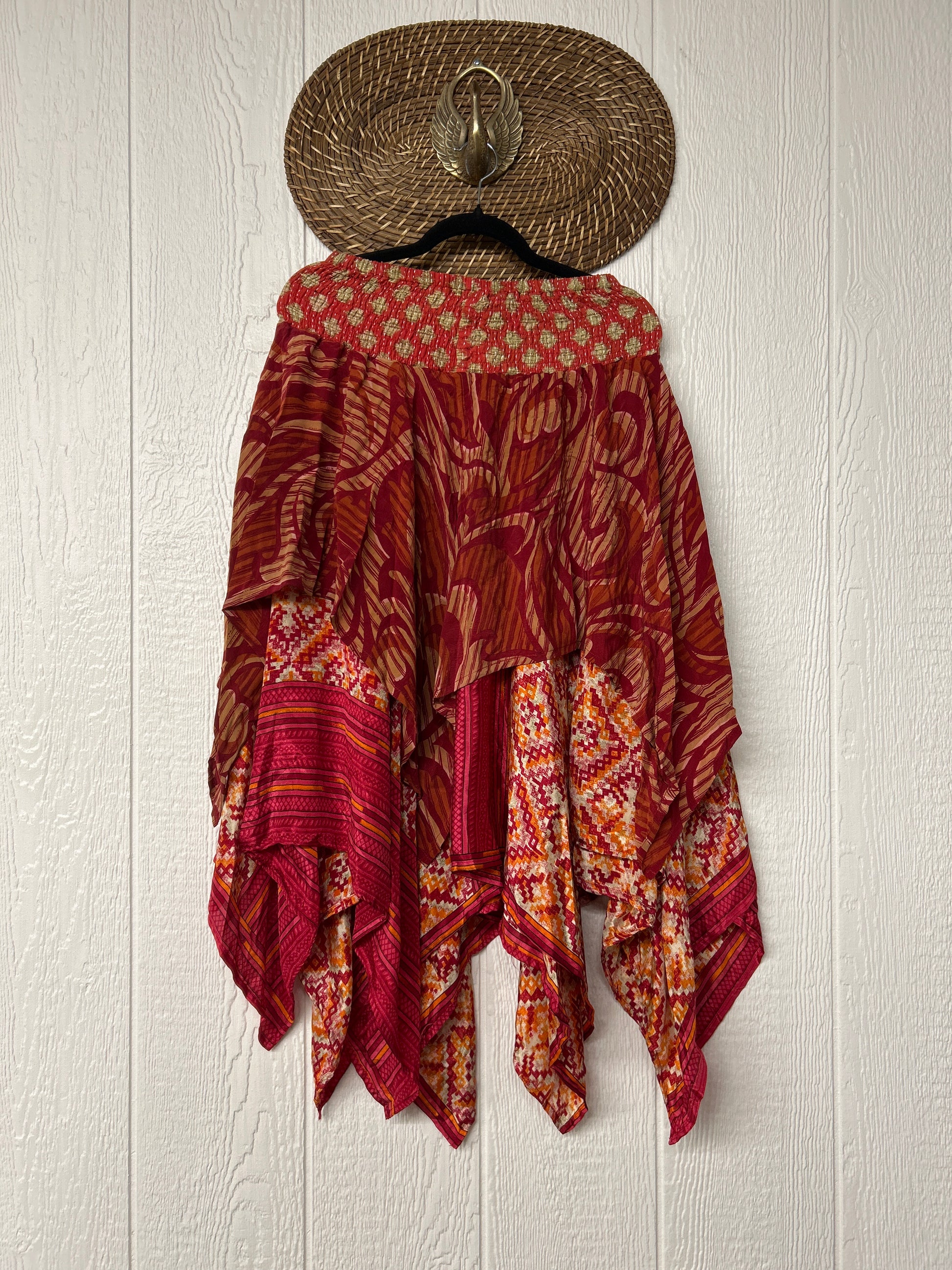 crafted from our ultra lux vintage crepe and ragulla sari. Features a rock star asymmetrical hem and stretchy pareo kantha waistband. This versatile piece can be pulled up to be worn as a tunic!