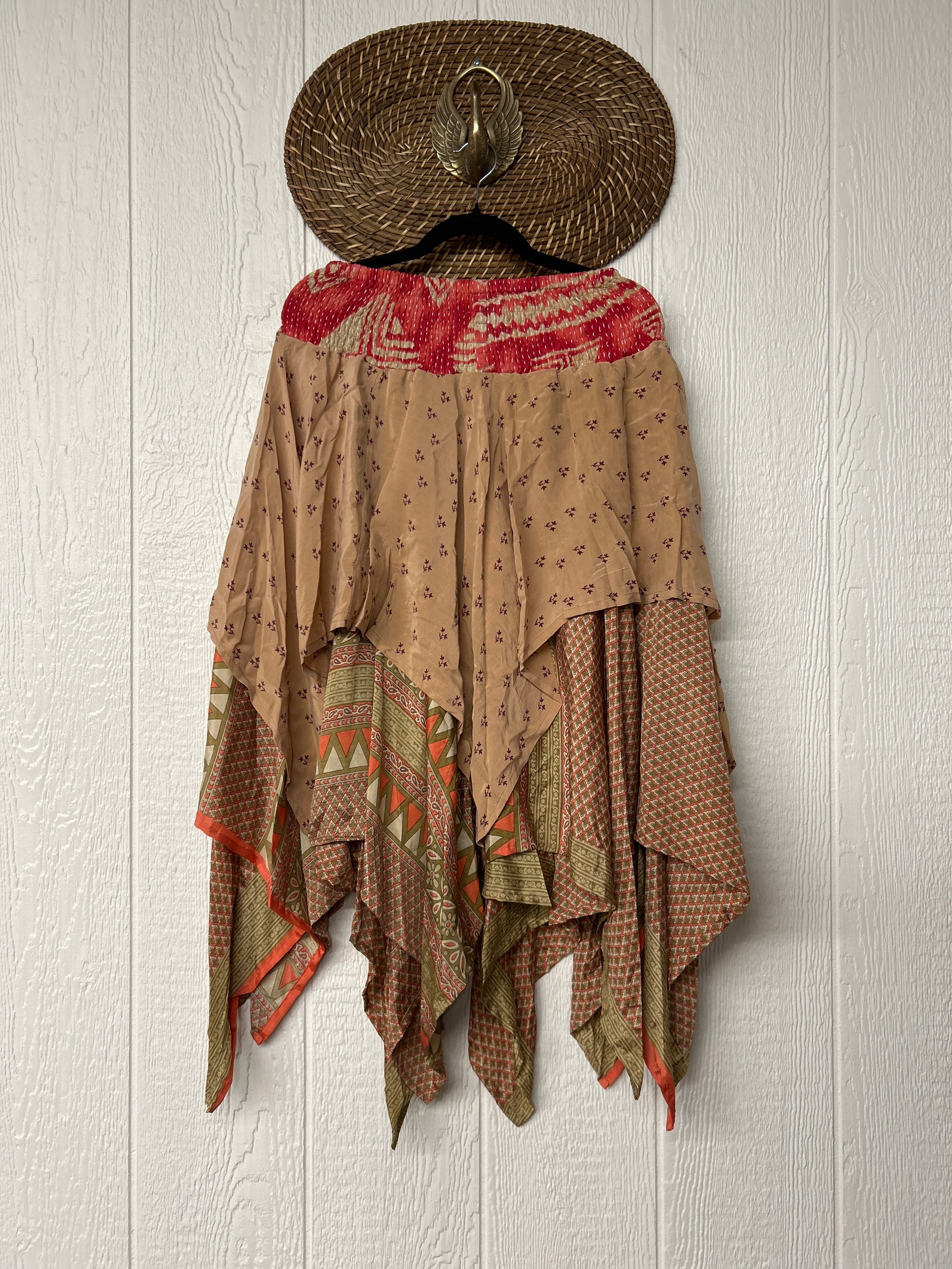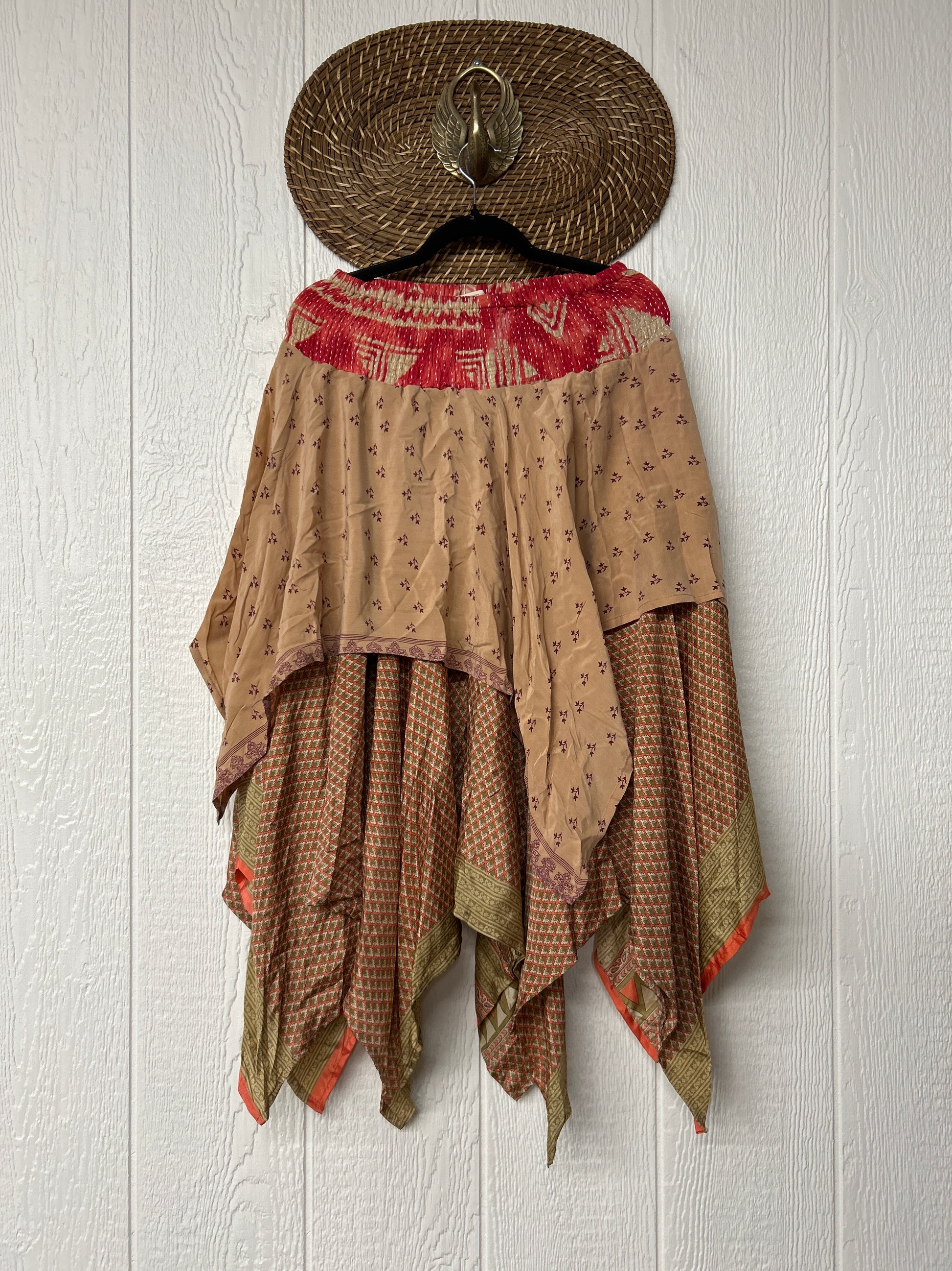 crafted from our ultra lux vintage crepe and ragulla sari. Features a rock star asymmetrical hem and stretchy pareo kantha waistband. This versatile piece can be pulled up to be worn as a tunic!