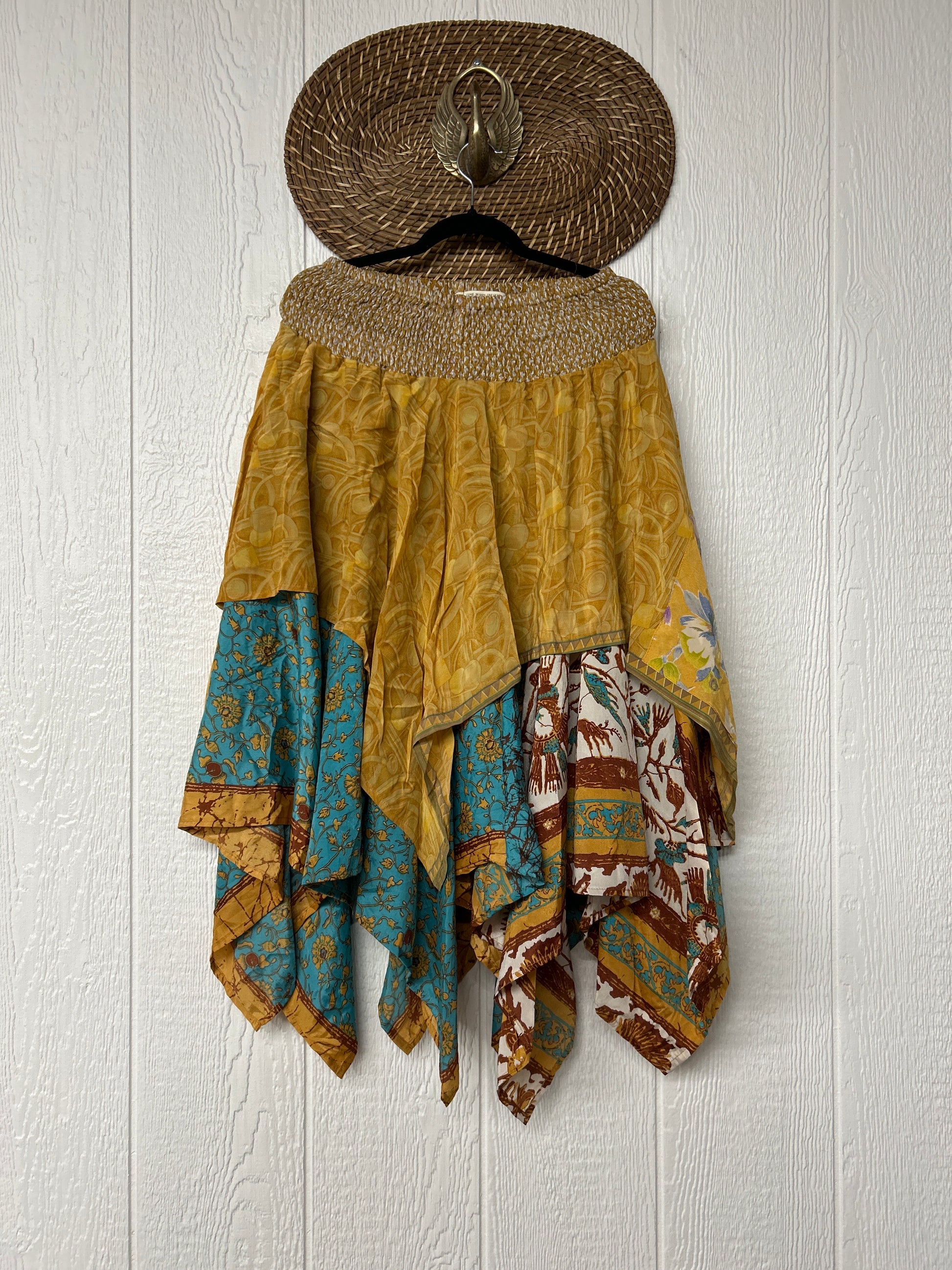 crafted from our ultra lux vintage crepe and ragulla sari. Features a rock star asymmetrical hem and stretchy pareo kantha waistband. This versatile piece can be pulled up to be worn as a tunic!