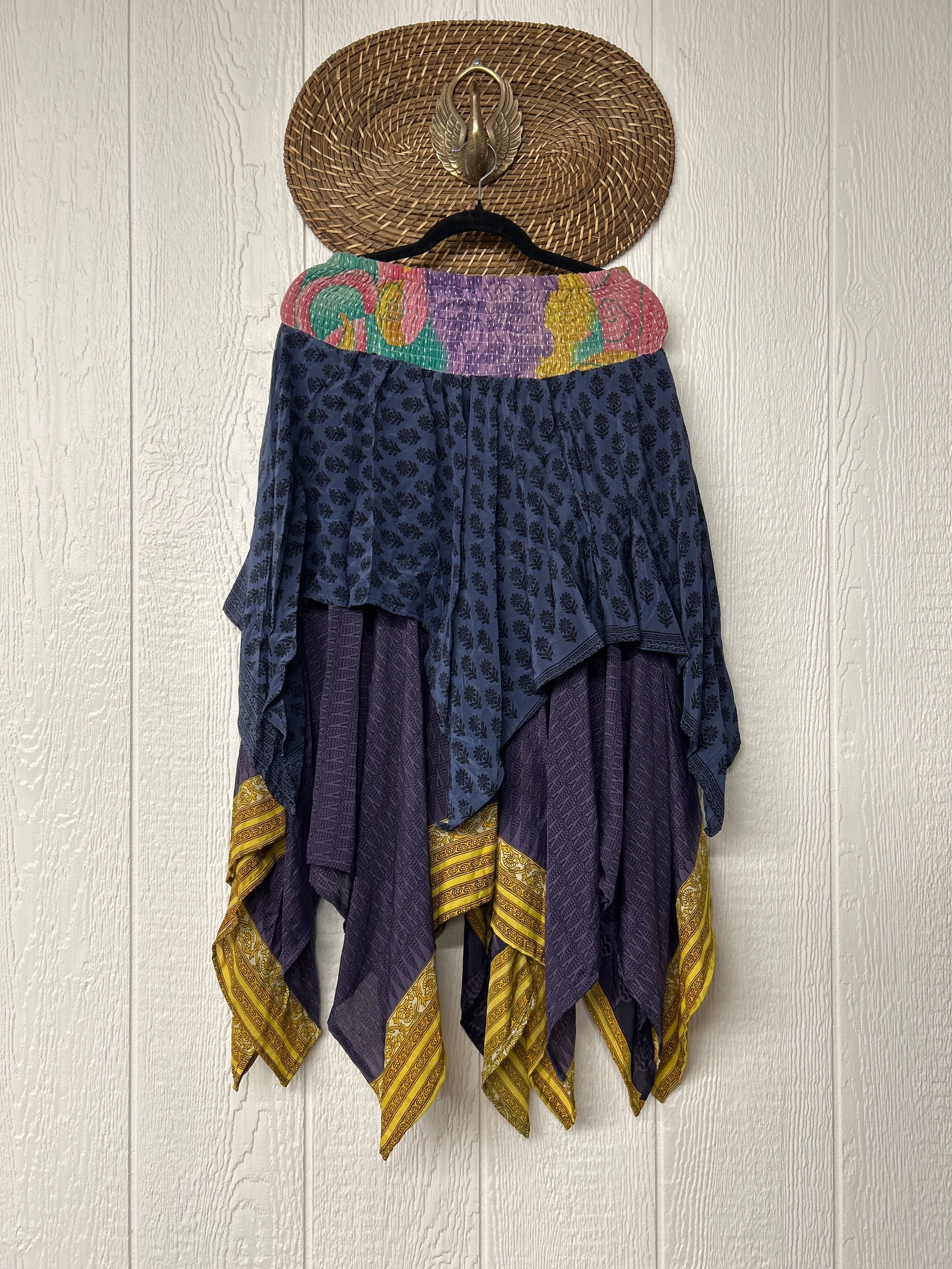 crafted from our ultra lux vintage crepe and ragulla sari. Features a rock star asymmetrical hem and stretchy pareo kantha waistband. This versatile piece can be pulled up to be worn as a tunic!