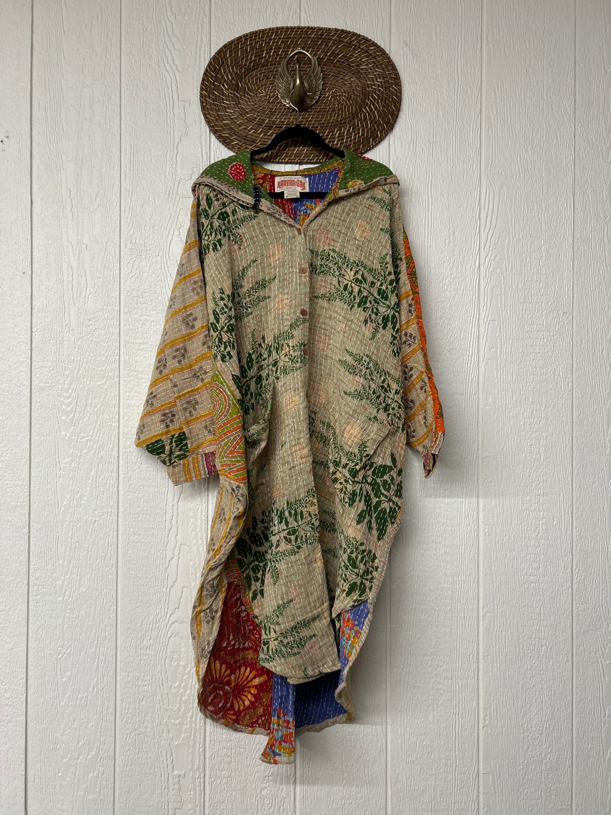 Made from our hand kantha stitched vintage cotton sari, this piece of wearable art features a Button-down opening with functional buttons, slouchy outer pockets, billowy sleeves, a rounded hemline and a vibey hood. The perfect maxi to compliment your favorite kantha pants or bell bottoms.