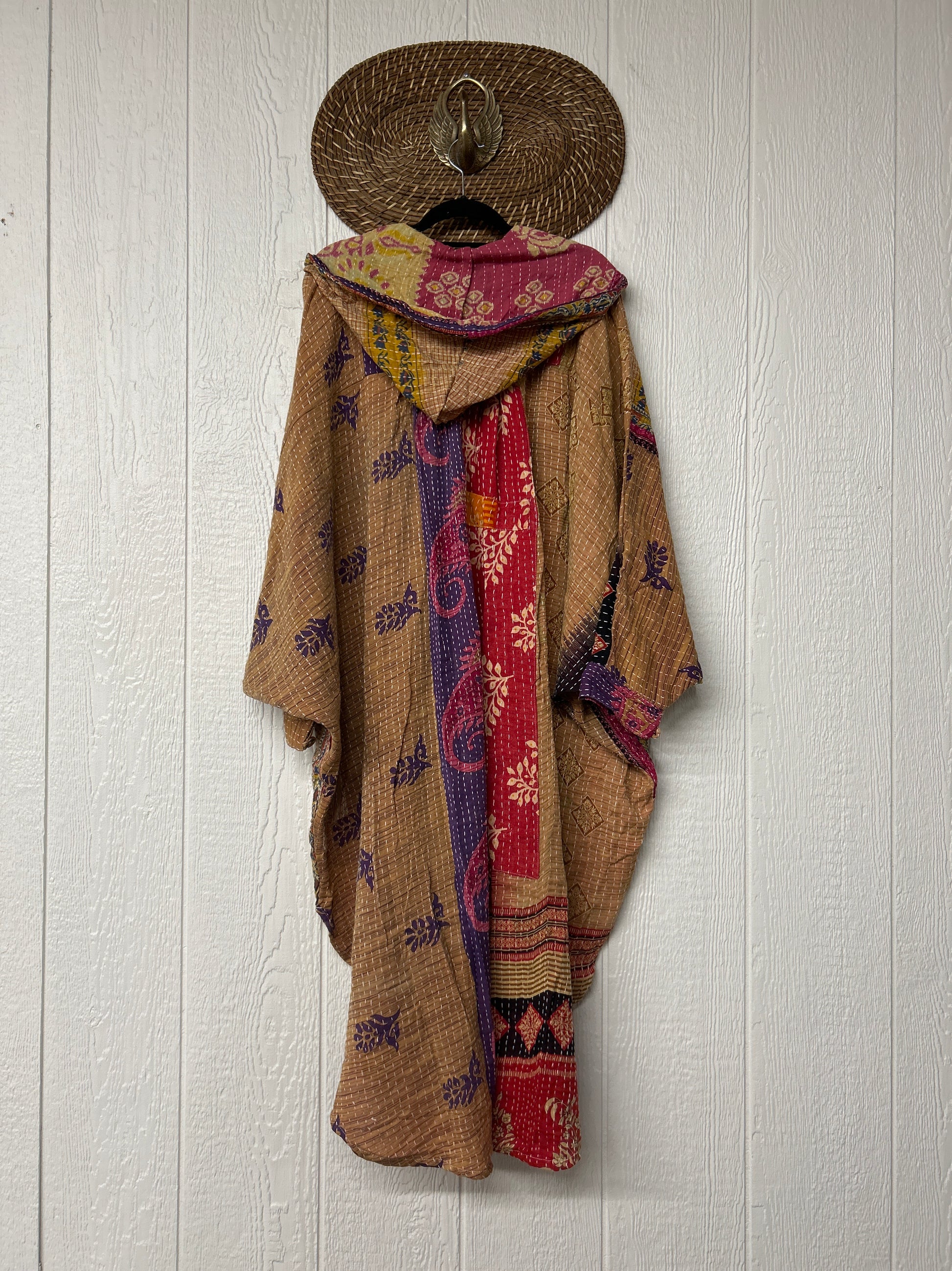 Made from our hand kantha stitched vintage cotton sari, this piece of wearable art features a Button-down opening with functional buttons, slouchy outer pockets, billowy sleeves, a rounded hemline and a vibey hood. The perfect maxi to compliment your favorite kantha pants or bell bottoms.