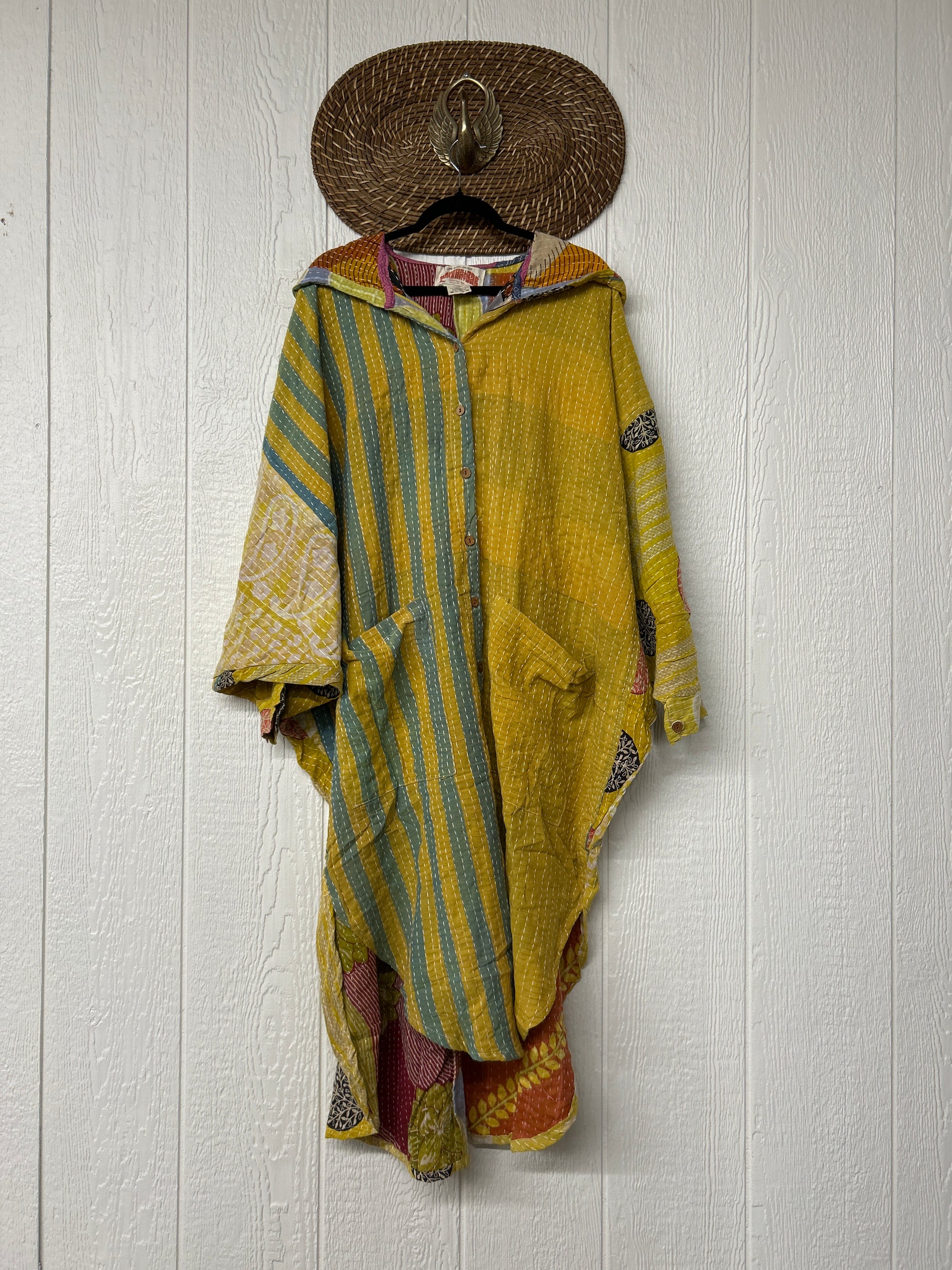 Made from our hand kantha stitched vintage cotton sari, this piece of wearable art features a Button-down opening with functional buttons, slouchy outer pockets, billowy sleeves, a rounded hemline and a vibey hood. The perfect maxi to compliment your favorite kantha pants or bell bottoms.