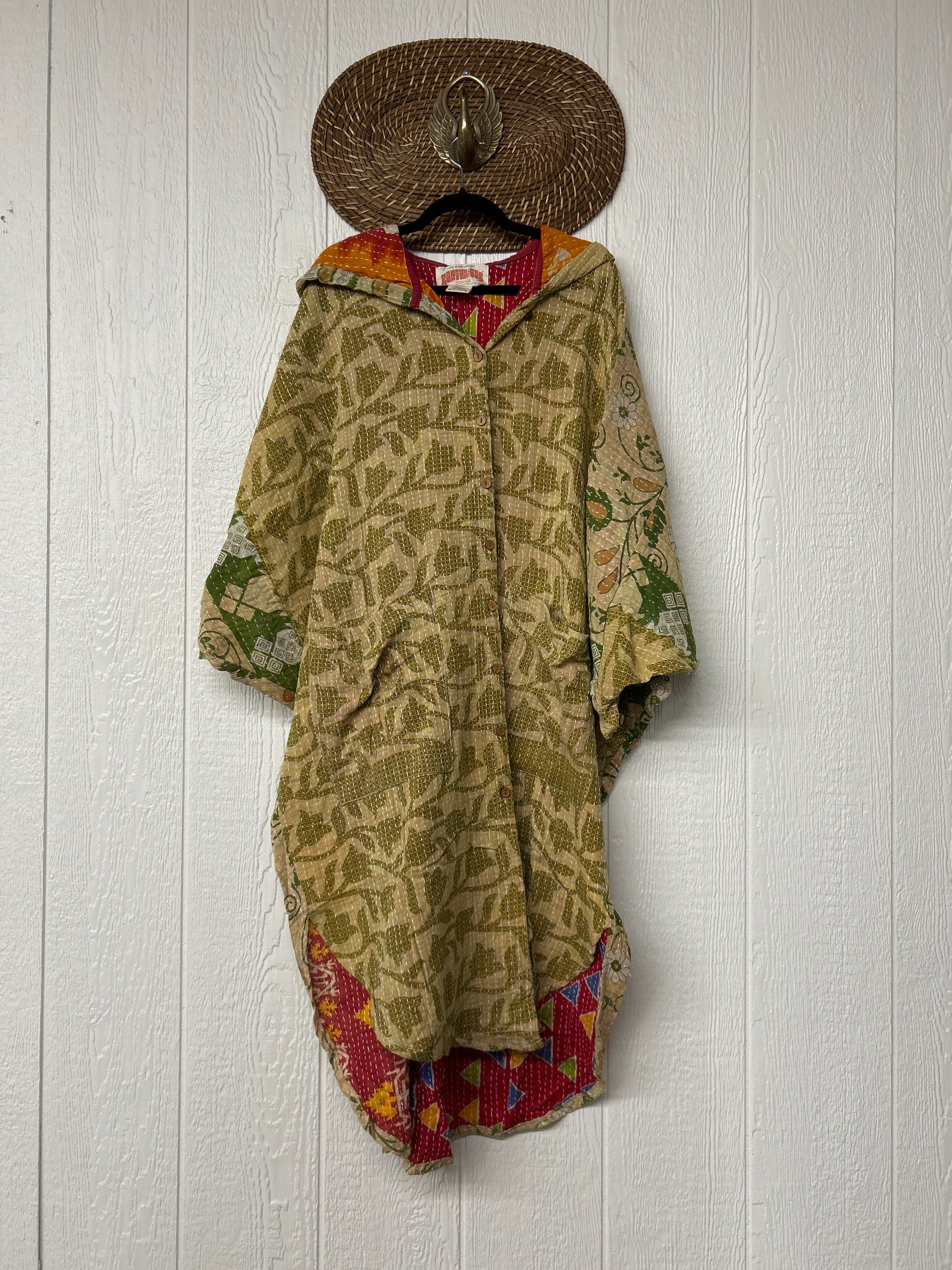 Made from our hand kantha stitched vintage cotton sari, this piece of wearable art features a Button-down opening with functional buttons, slouchy outer pockets, billowy sleeves, a rounded hemline and a vibey hood. The perfect maxi to compliment your favorite kantha pants or bell bottoms.