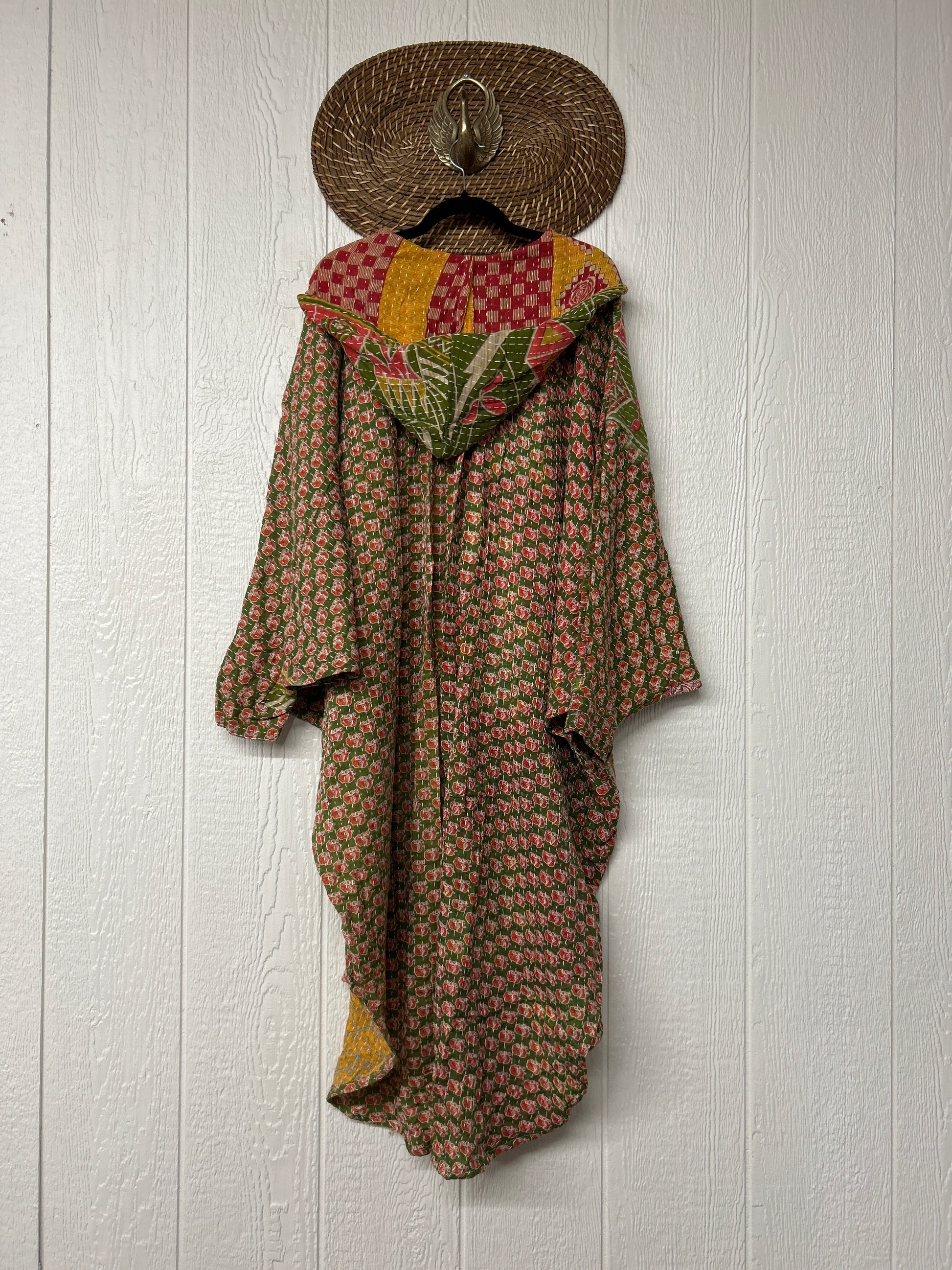 Made from our hand kantha stitched vintage cotton sari, this piece of wearable art features a Button-down opening with functional buttons, slouchy outer pockets, billowy sleeves, a rounded hemline and a vibey hood. The perfect maxi to compliment your favorite kantha pants or bell bottoms.